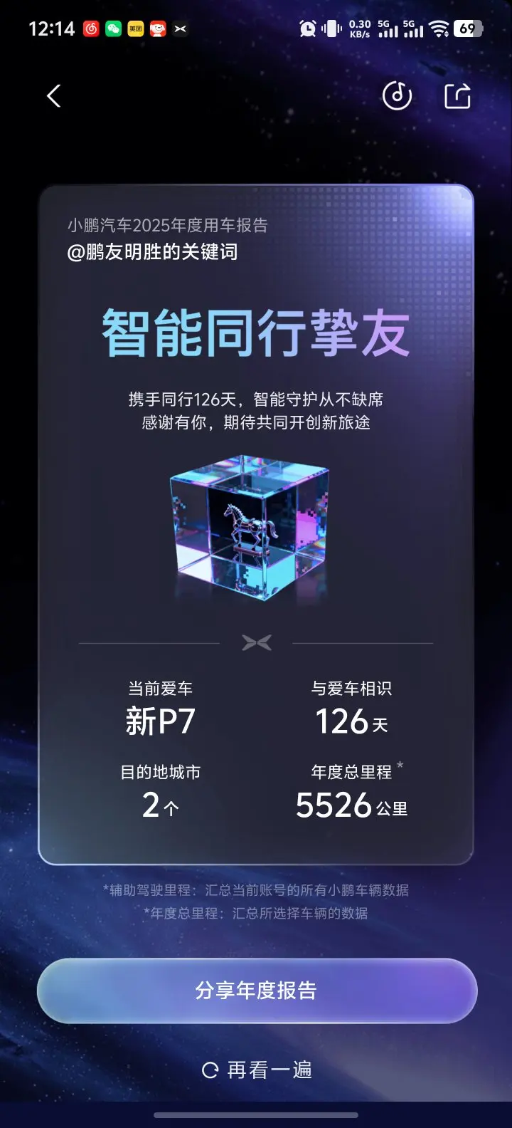 年度用车报告里的每一组数据,都是P7陪伴的见证:全年超 1237 公里的智驾里程、13.1kWh/100km的超低电耗、无数次与小P的温馨互动、超充站的默契打卡……575L的超大后备厢装下过露营装备的自由,Nappa真皮座椅的通风加热承包了冬夏的舒适,23颗HIFI级扬声器带来了独处时的静谧享受,这台车早已融入生活的每一个重要瞬间 。