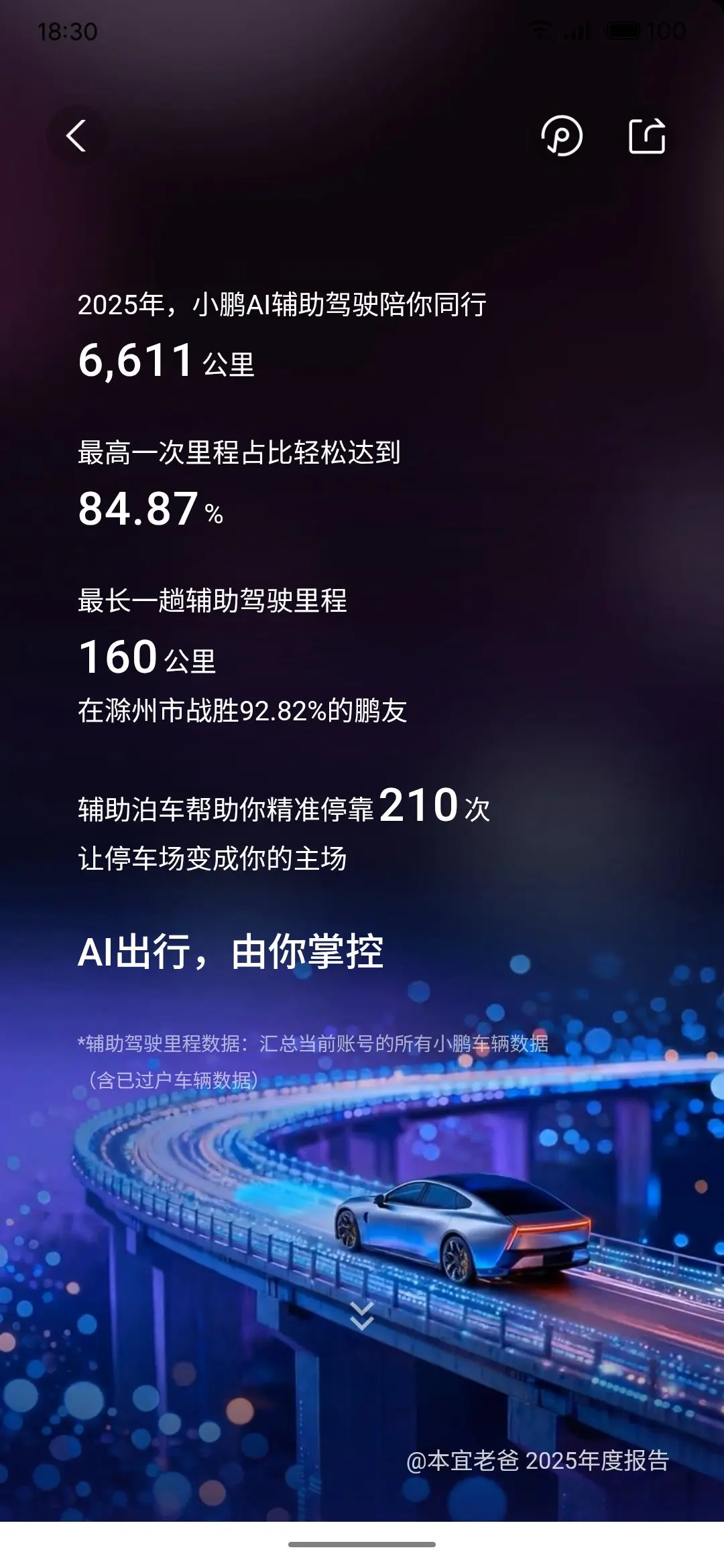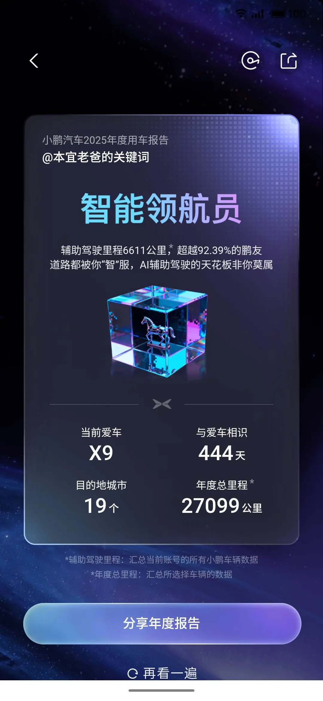 #小鹏汽车、#小鹏X9、#2025小鹏智能用车报告2025年总里程27099公里,去了19个城市,智驾里程6611公里!因为自己特别喜欢和家人一起自驾的时光,所以总想着开着X9去往不同的城市,感受不一样的文化,美食!刚好时间也允许,2025我们去了湖南,湖北,江西,广东,山东,江苏!以前开车需要高度集中注意力,所以长途开车很累!有了小鹏X9确实轻松了很多,智驾带来的方便真心不错,以后再也离不开智驾啦!!2026,期待更多的美好时光!依旧在路上ing