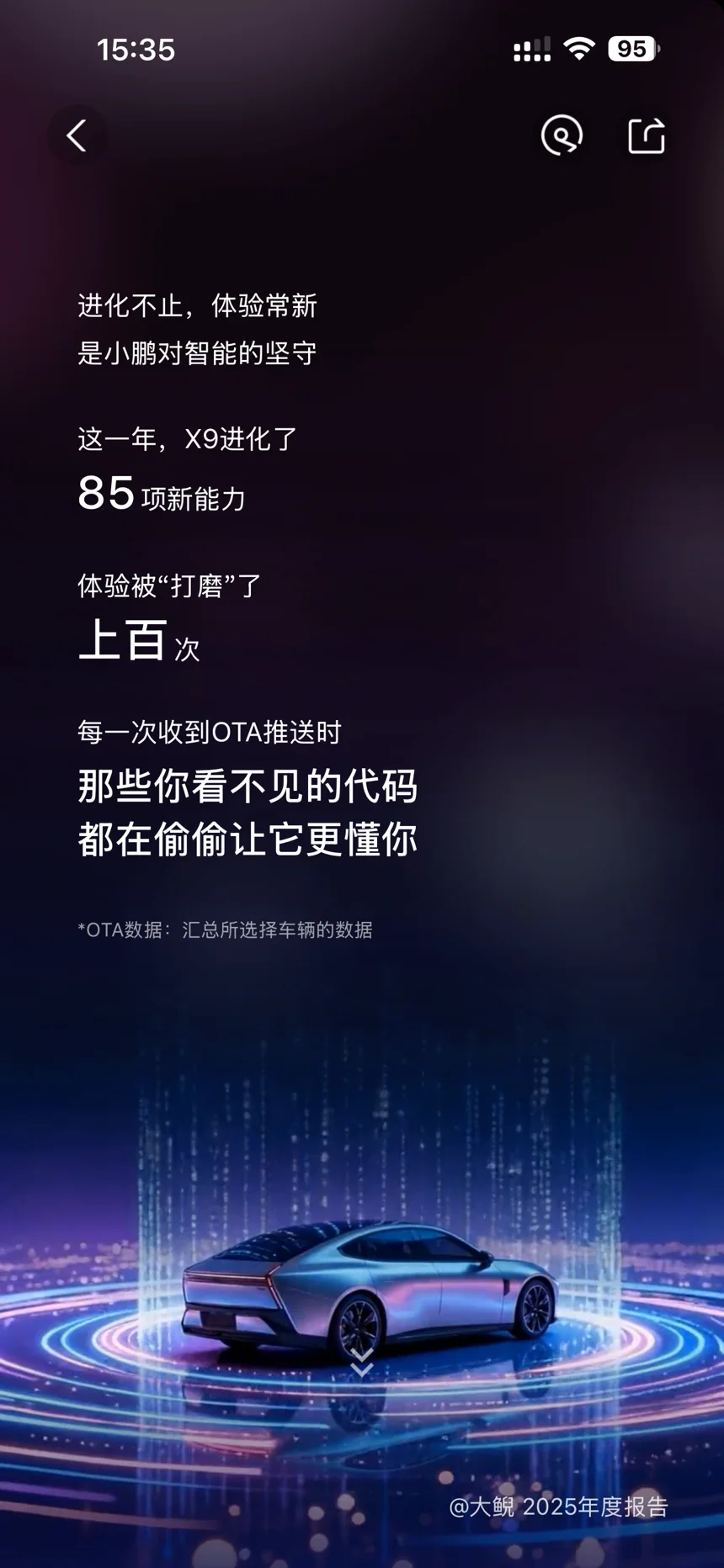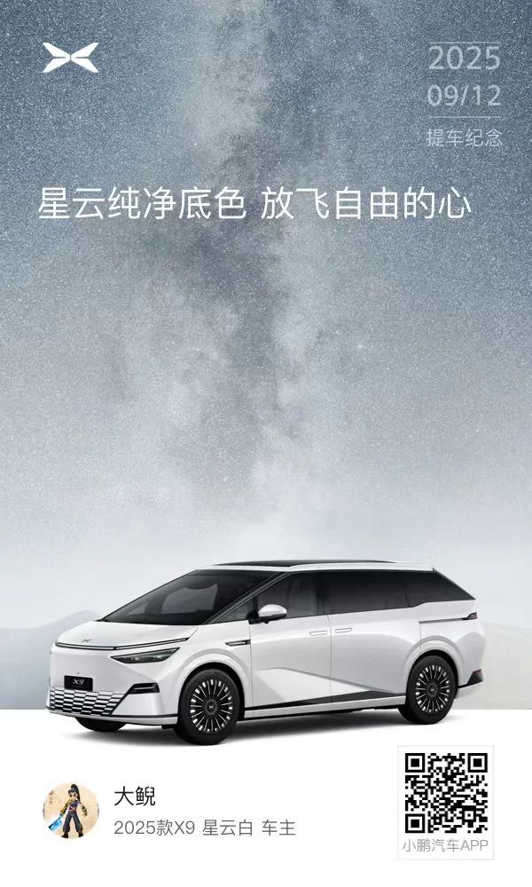 2025年9月25日提车。从2020年的G3,到2023年的G6,再到今年的X9,小鹏汽车每次升级都有进步,从车道保持进化到现在的NGP,深刻体会到智能化越来越厉害。G6、X9现在做为家庭每天出行用车,从提车到现在,已经开了快一万公里了,如果不信任小鹏,肯定不会保留两台同品牌的纯电汽车当做家庭用车。希望小鹏不负期许,越来越好,加油!