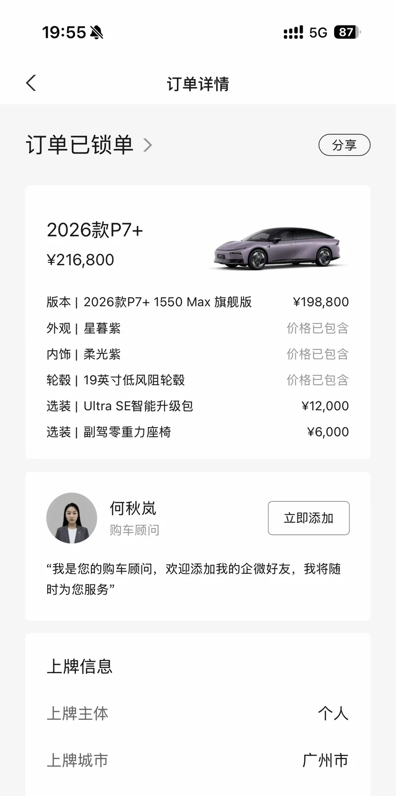 今天终于给我的小鹏P7+ 2026款锁单啦!选的是1550 Max旗舰增程版,外观冲了星暮紫,内饰搭了柔光紫,轮毂是19英寸低风阻款,还加选了Ultra SE智能升级包和副驾零重力座椅