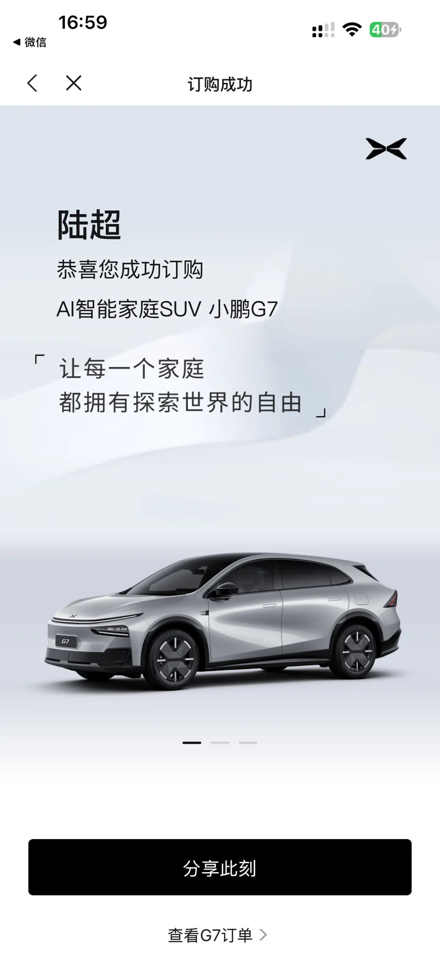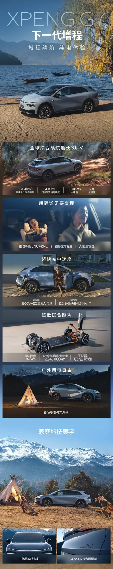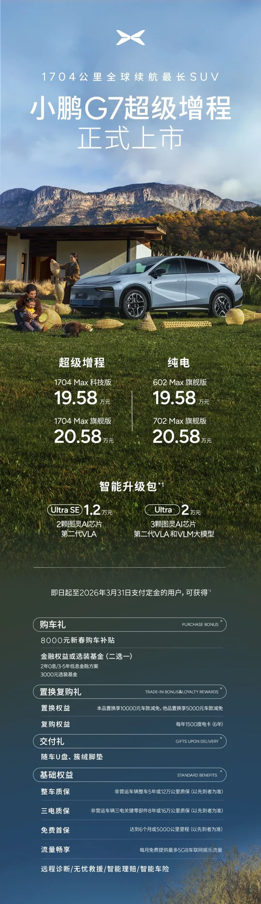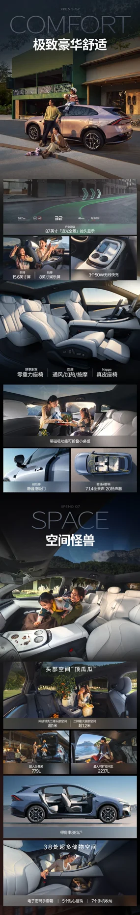 #晒小鹏G7大定# 上市啦,新款G7上市啦。小鹏的双能战略正式拉开了帷幕。超级增程和纯电同级同价,19.58万起,配置升级,价格实惠,跟同级车相比更有竞争力。下定,还等什么,小鹏的目的地超充建设超前,网点非常多,补能方便,指引醒目,降锁方便,充电速度快,带来极速补能体验,站点管理给力,无油车占位,让电车出行更加随心自由。