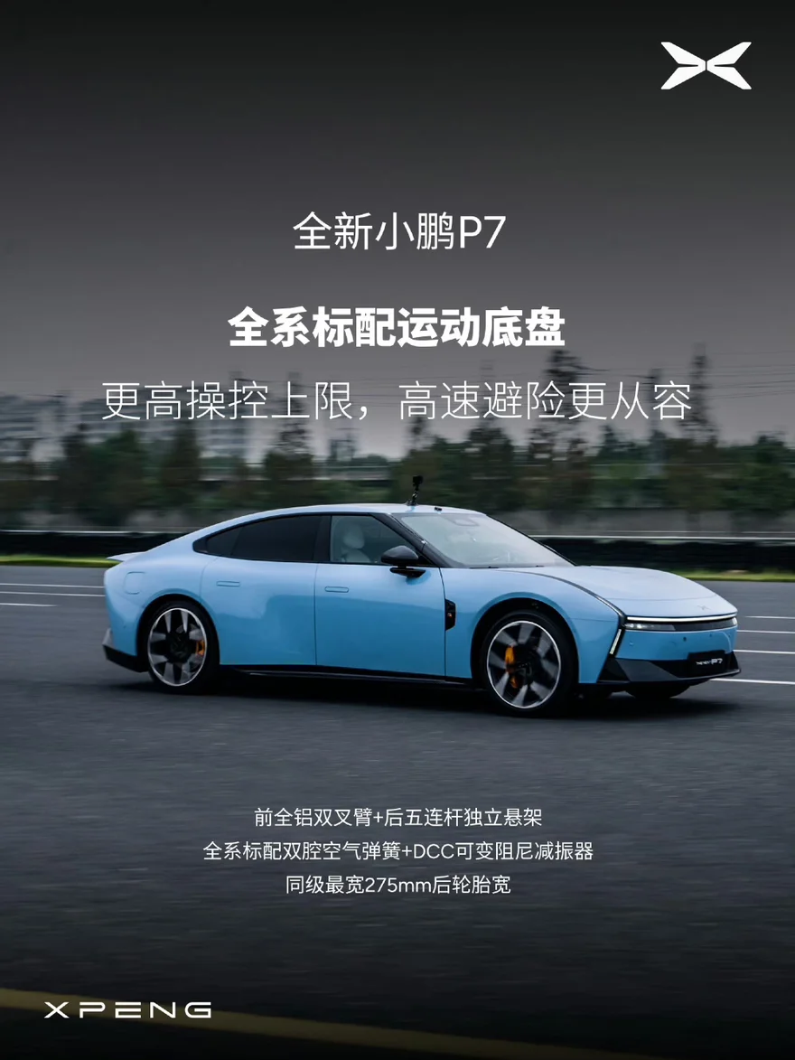 话说回来,这么多的豪华配置,具体能带来哪些好处呢?我觉得最直观的感受就是操控性和安全性大大增加了!最新的测试表明,全新小鹏P7可以麋鹿测试90公里通过,还能扛住连续24脚百公里紧急刹停不衰减,第三方底盘拆解发现,全新小鹏P7同级唯一标配威巴克双腔空悬,同时全系标配了同级最厚的刹车盘,让车开得快,刹得稳,很安静!同级领先低重心、大宽体,不推头,不甩尾。前后重量分配接近完美的50:50,稳就是快!极限避障更有底气,日常驾驶更安心!