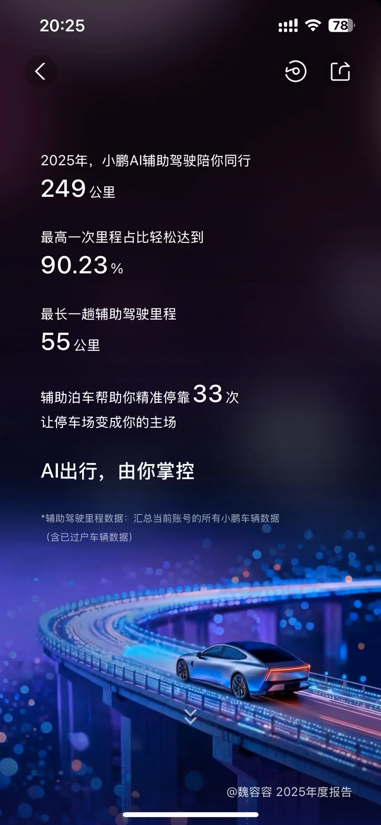 翻出小鹏App的2025年度用车报告,这台家庭出行好搭档的陪伴时光,用数据一帧帧定格~年度行驶2073公里,足迹遍布5座城市,跨城自驾3次;纯电行驶占比高达78%,CLTC 452km纯电续航轻松覆盖日常通勤,综合续航1602km彻底打消长途顾虑;XNGP智驾里程占比82%,不管是早晚高峰的城市道路,还是蜿蜒的城际高速,都稳稳护航;全年超充补能12次,800V高压平台加持,12分钟补能70%,短暂停留就能满电出发;小P语音互动多次,调节空调、切换儿歌、规划路线,一句指令全搞定,堪称带娃出行的“智能奶爸”。