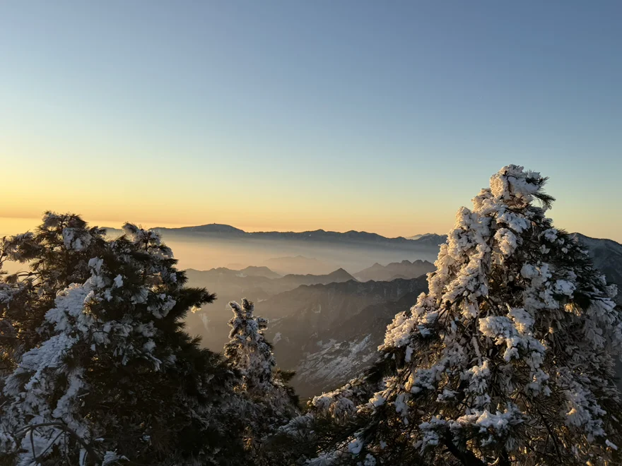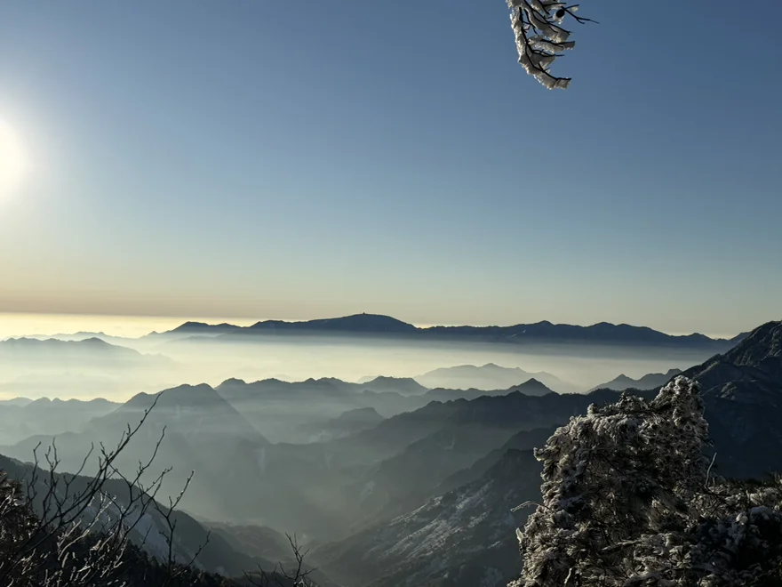 当晨光初现,眼前豁然开朗,我已浮于云海之上。天地之间万籁俱寂,唯有晶莹的雾凇挂满枝头,每一簇冰晶都在初升的阳光下折射出钻石般的光芒,将连绵的山脊雕琢成一片纯净的冰雪仙境。