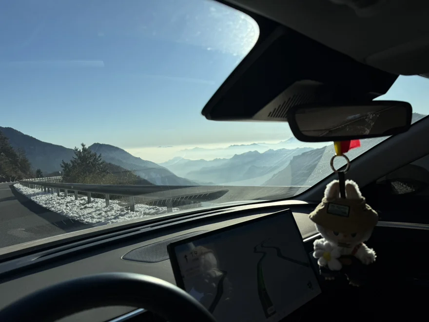 我停下车,换上冰爪,跟随登山者的足迹向上。山风掠过,细碎的冰晶簌簌飘落,在晨光中飞舞。回望来路,我的小鹏安静地停驻在山崖边,流线型的车身映衬着身后的云海与雾凇林,宛如一幅宁静的未来画卷。这趟由科技承载的寻冬之旅,最终让我收获了最原始而壮美的自然馈赠——那是江南冬日里,最极致、最诗意的浪漫。