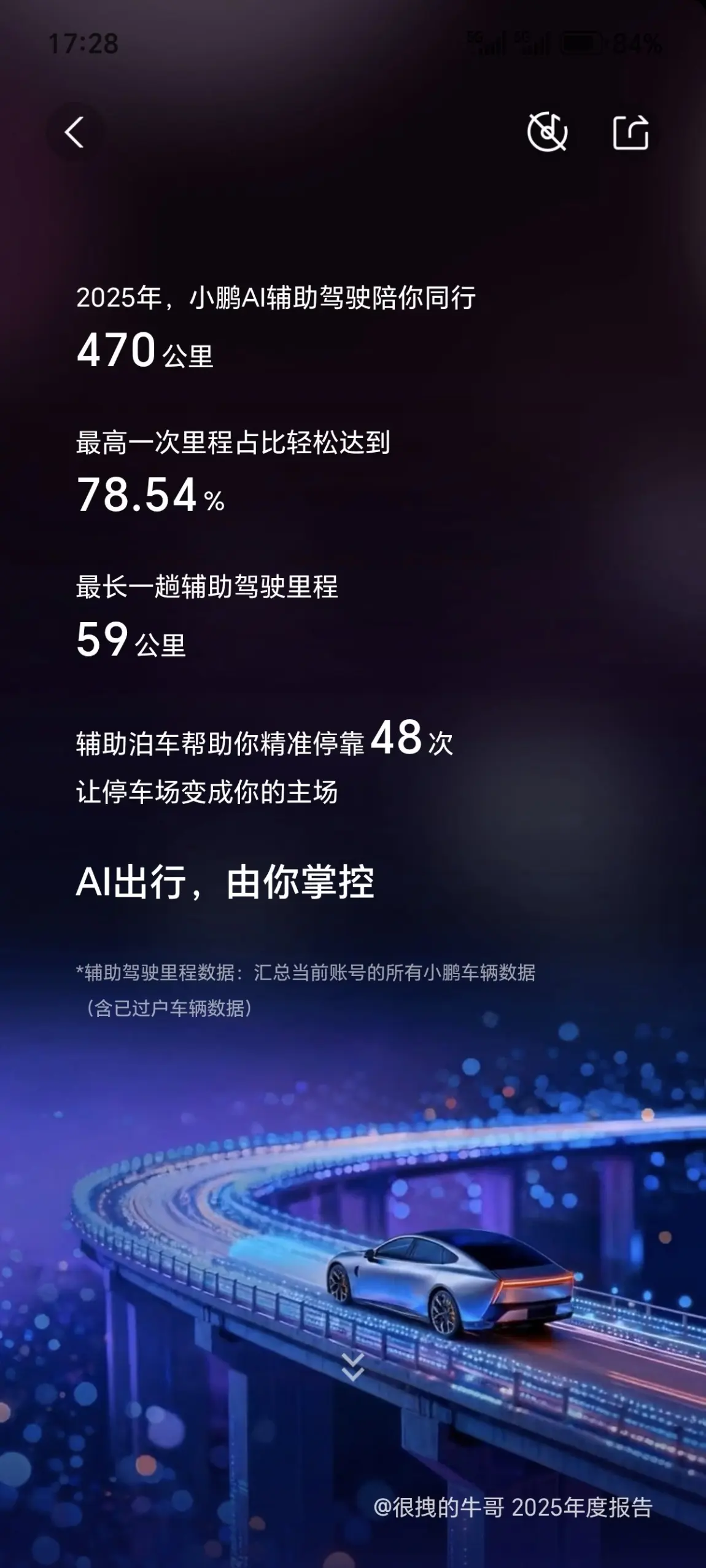 我的新p7年度用车报告10月底提车到现在开了2个多月啦,从一开始不敢使用智驾ngp到现在敢放心交给它开,驾驶的范围也越来越远,在高速上开启ngp能轻松很多。手开的时候觉得方向盘、电门都很跟手,很好开,导航也很清晰,驾驶体验很好