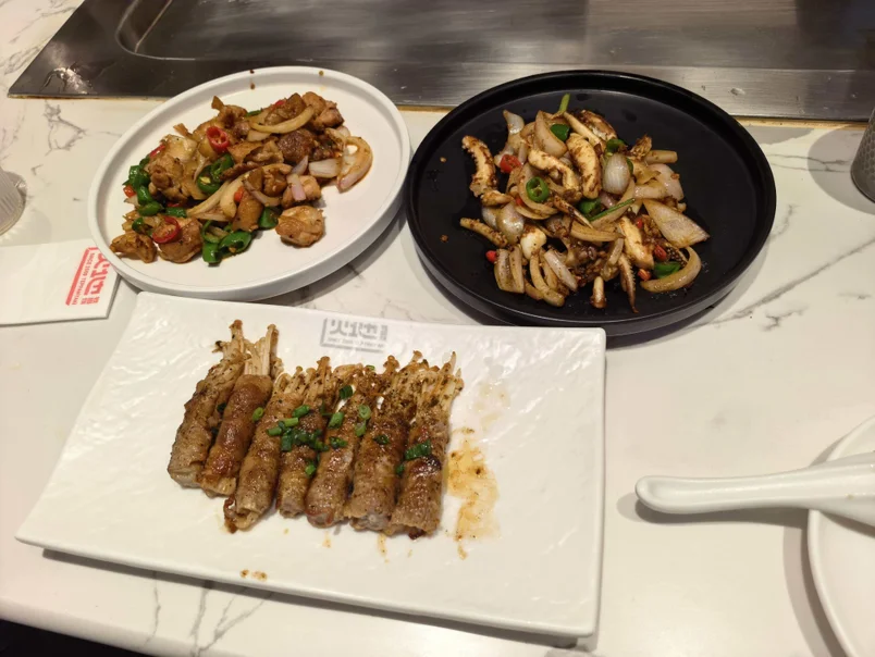 逛累了直奔藏在周边的宠物友好铁板烧店,这趟出行的高光时刻就此开启!店里对宠物超友好,毛孩子可以乖乖趴在脚边陪吃,不用特意安置。最绝的是他家铁板烧全是现点现做,新鲜的食材被师傅端到滚烫铁板上,滋啦的热油声伴着肉香瞬间散开,牛排煎得外焦里嫩、大虾烤得鲜甜弹牙,荤素搭配在铁板上翻炒出浓郁锅气,每一口都是新鲜热乎的美味。
