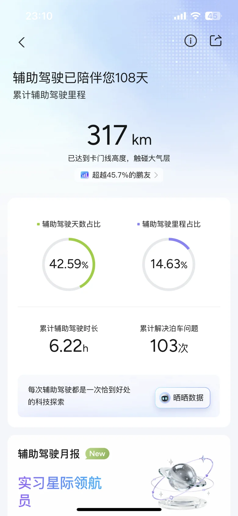 翻看这份辅助驾驶报告,记录了与智能驾驶系统的108天相伴,累计317公里的智能里程,相当于从地表驶入卡门线。6.22小时的智驾时间和103次的自动泊车,都见证着科技如何融入日常。这一年,智驾里程虽仅占总里程的14.63%,但在关键场景下的42.59%使用天数,足以说明MONA智能驾驶已成为了可靠的出行伙伴。