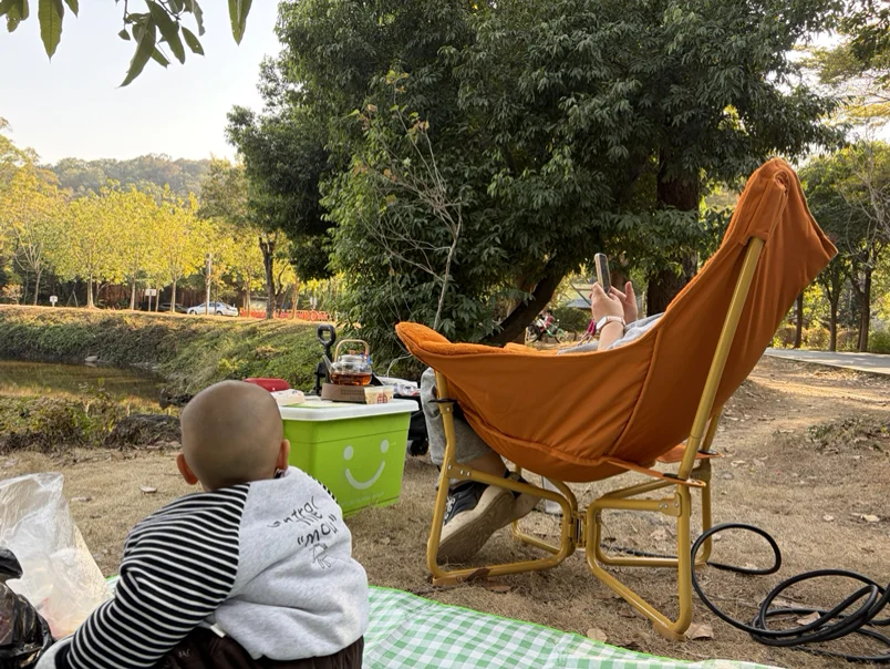 📸图4:宝妈瘫在躺椅上刷手机,宝宝抱着饮料瓶满草地跑~有车在旁边守着,安全又方便拿东西,带娃露营终于不狼狈了!