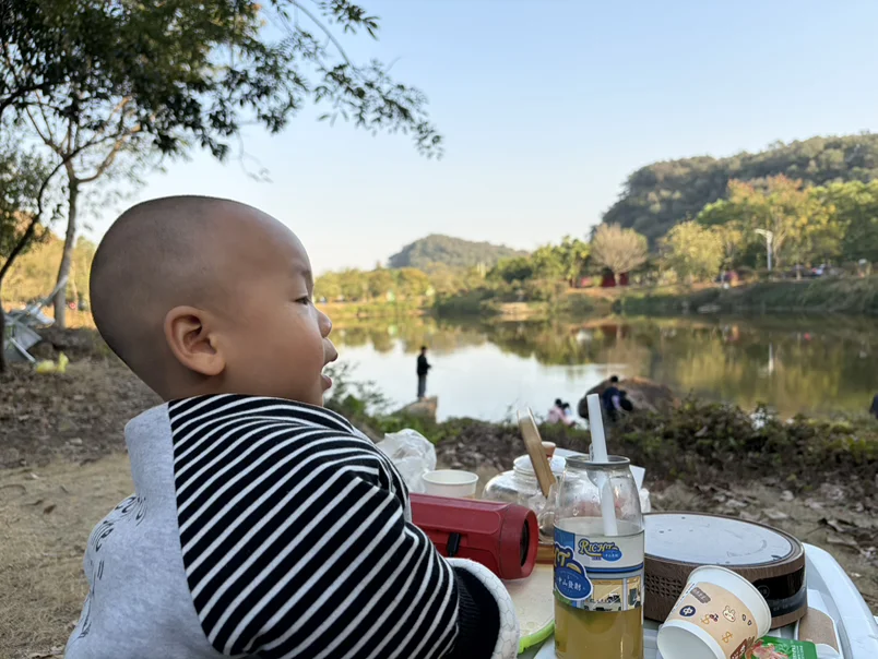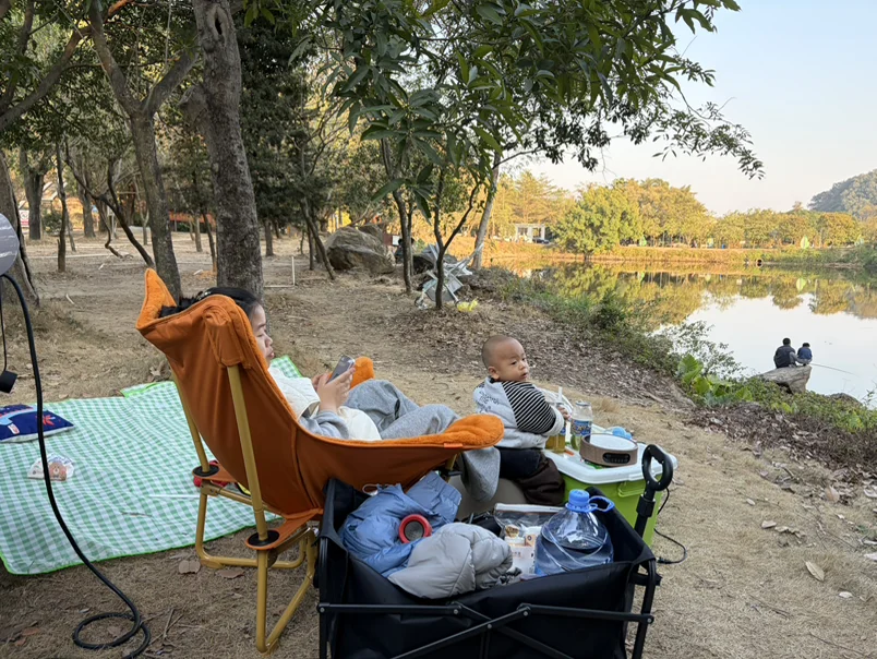 📸图2:小家伙对钓鱼的叔叔超好奇,盯着湖面能看半小时!还好MONA的语音助手喊一声就能放儿歌,带娃不用手忙脚乱~