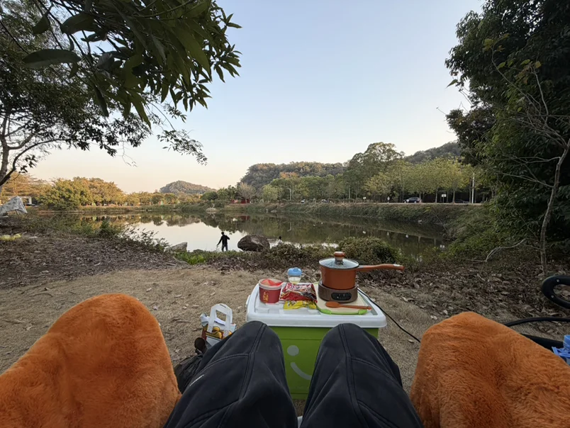 📸图1:刚到湖边就支棱起装备~宝宝盯着煮茶的小锅直冒星星眼,车机取电的1500W煮茶器刚好够用,湖风一吹连空调都省了🍵