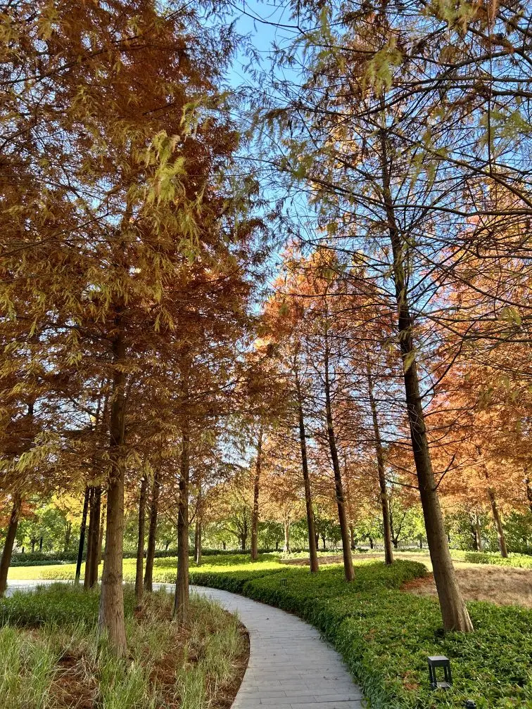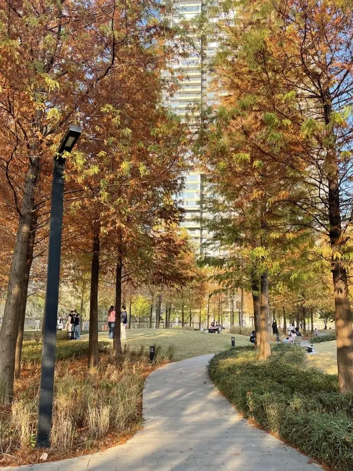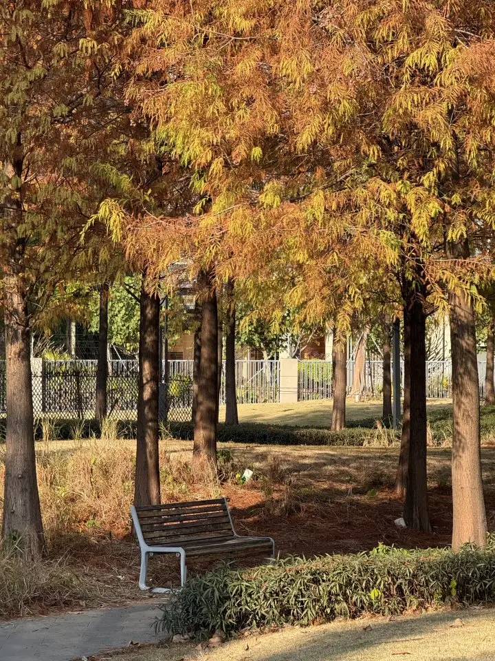 🍁回归正题,惠州曦江润府旁小公园里的落羽杉终于大面积红透了✨ 不是零星几棵,是一整丛红棕相间的落羽杉林,随便往那儿一站,都是自带滤镜的秋日大片!走进公园瞬间被治愈——成片的落羽杉整齐排列,焦糖色、褐红、金黄层层渐变,风一吹,如絮般的叶子轻轻飘落到脚边。踏着栈道穿行林间,阳光透过枝叶洒下斑驳光影,媳妇忙着拍照,娃追着落叶跑,随手按下快门都是温馨大片。