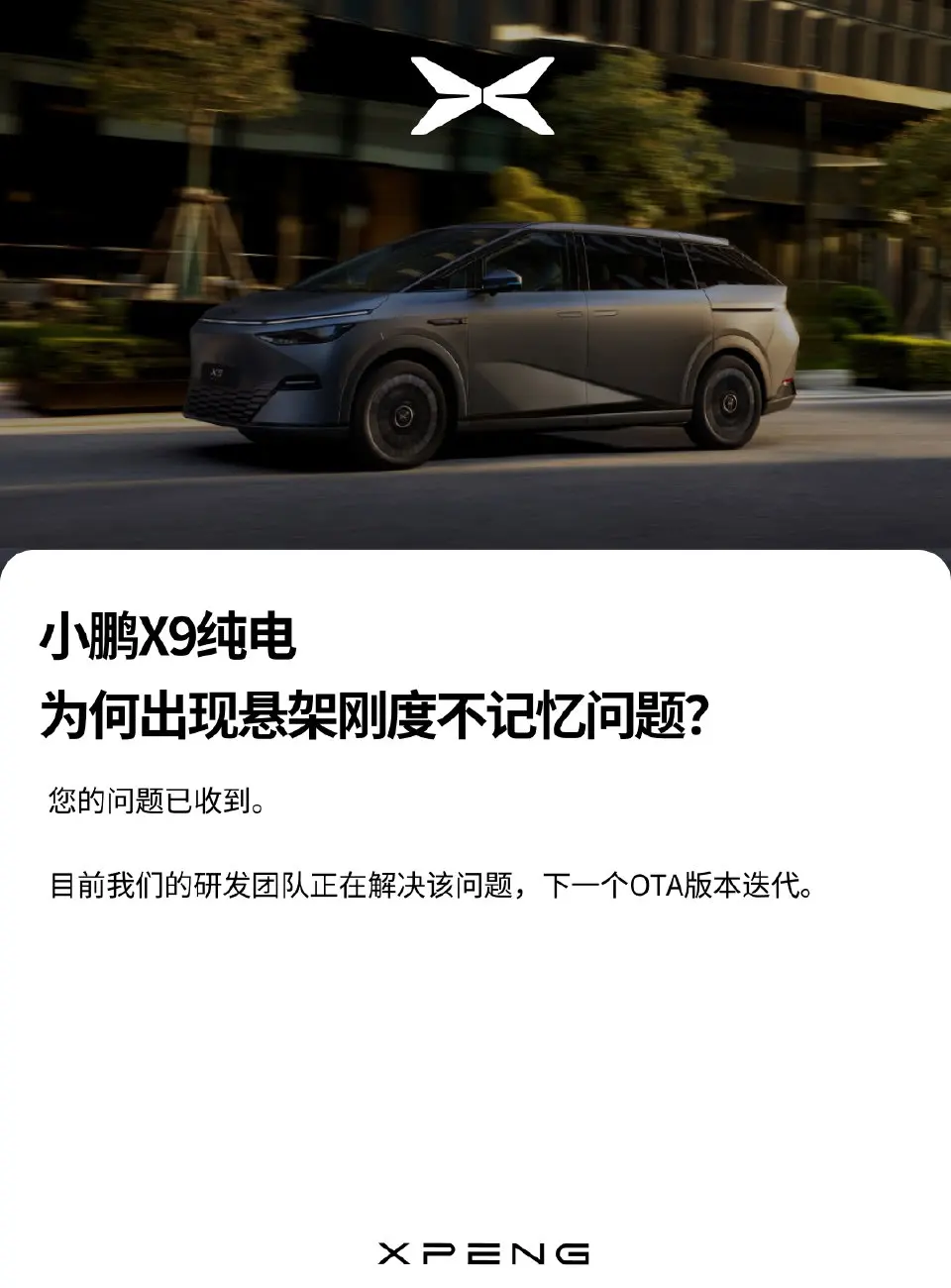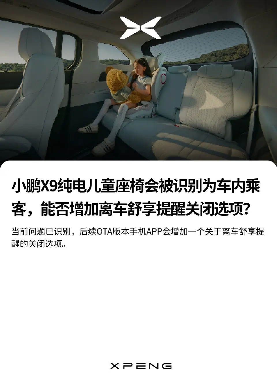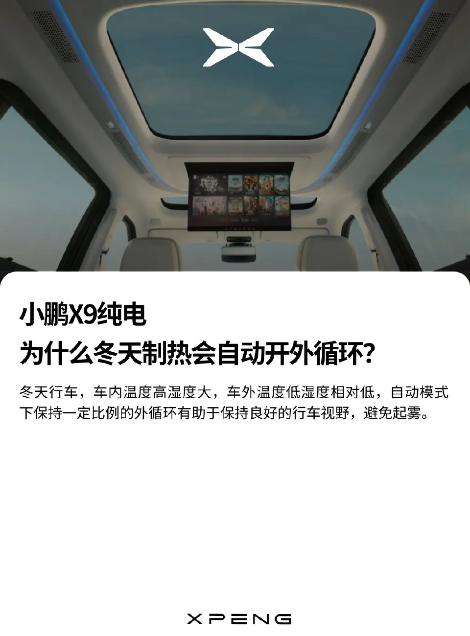 小鹏X9纯电答用户问【第六期】上线!1️⃣ 小鹏X9纯电为什么冬天制热会自动开外循环?2️⃣ 小鹏X9纯电儿童座椅会被识别为车内乘客,能否增加离车舒享提醒关闭选项?3️⃣ 小鹏X9纯电为何出现悬架刚度不记忆问题?4️⃣ 小鹏X9纯电是否支持其他品牌的21kw的家充桩?5️⃣ 小鹏X9纯电有什么场景化的使用技巧?