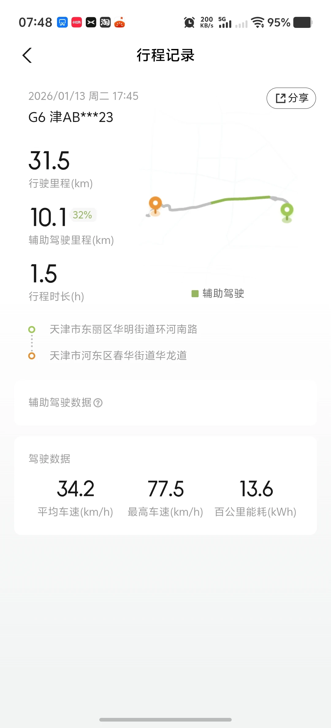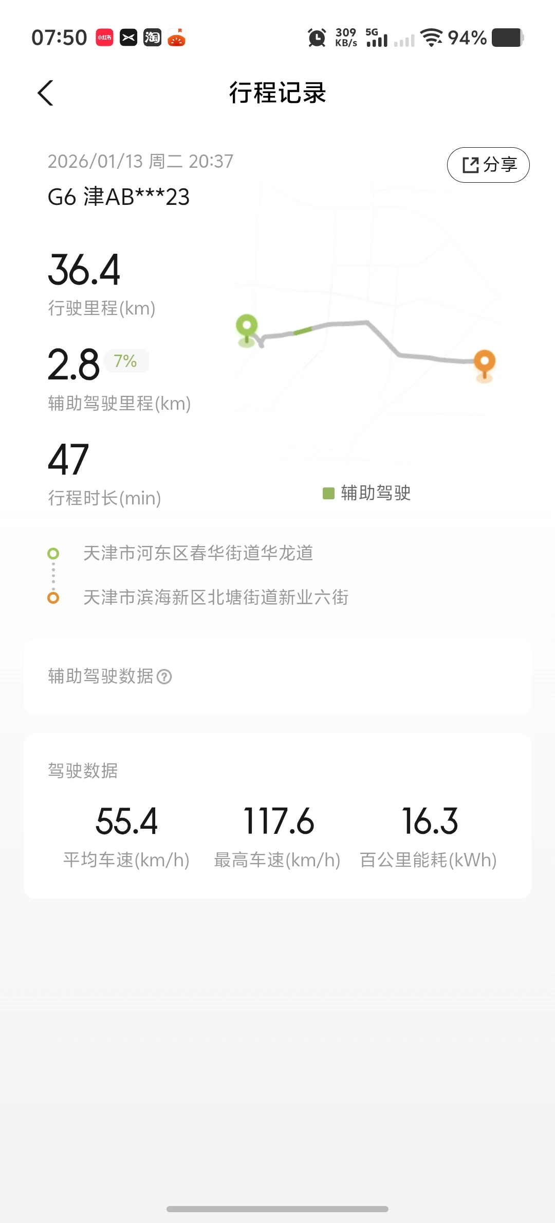 新年首驾小鹏G6,载上老友赴佳宴,满电出发一路顺,推杯换盏皆欢愉 一来一回七十多公里 电耗表现相当可以