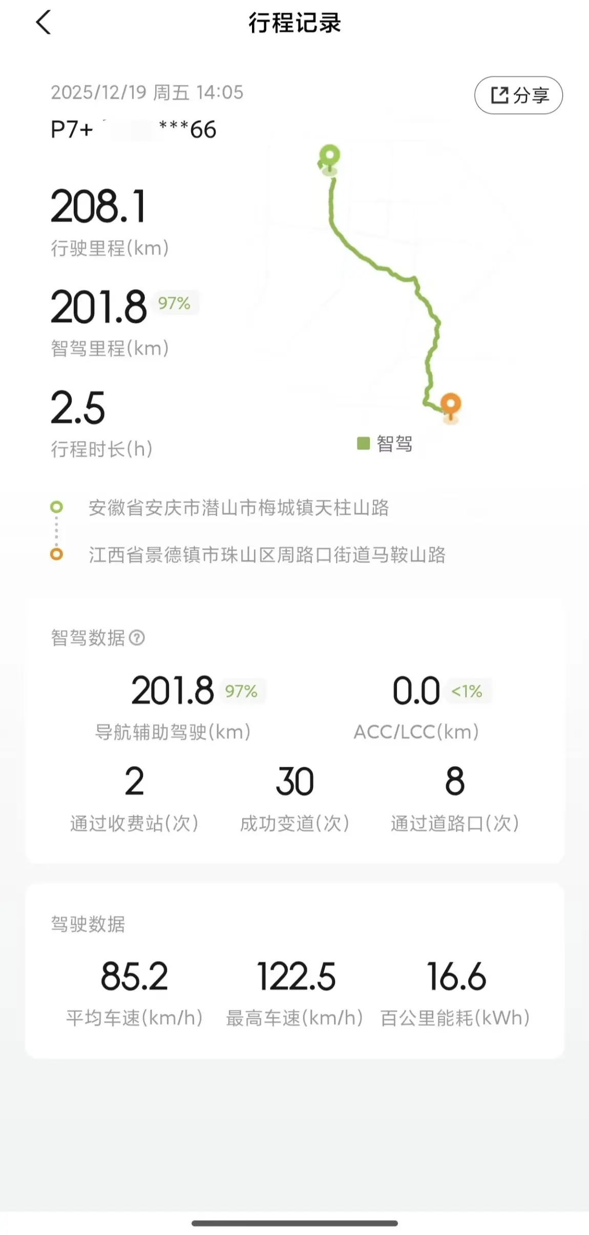今年智驾经过了九个城市,图四是最满意的智驾里程,200km高速全程智驾无接管,图五是最满意电耗里程,也跟当天天气有关吧,出太阳了