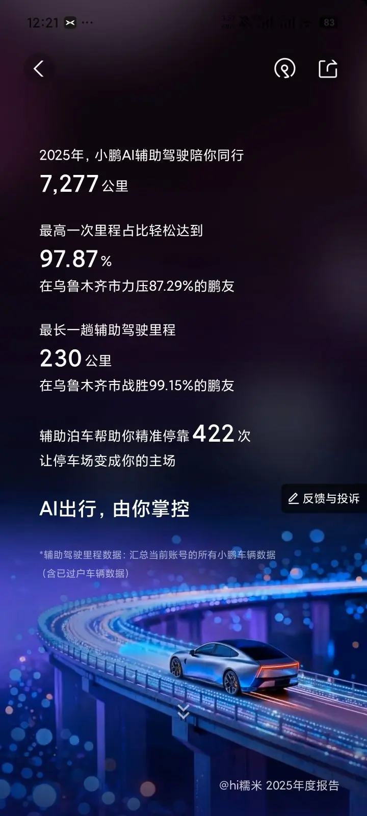 小鹏开了一年了,各种事情也遇到过了,冷的,热的地方也去了,纯电在补能条件好的情况下,真的很香,一年开了22243公里,辅助驾驶干了7000多公里,现在出远门必须开ngp丝滑,好用,一年省了小一万块钱油钱,又可以多吃点好吃的了,希望在升级进化,能关怀老车主把🤪🤪