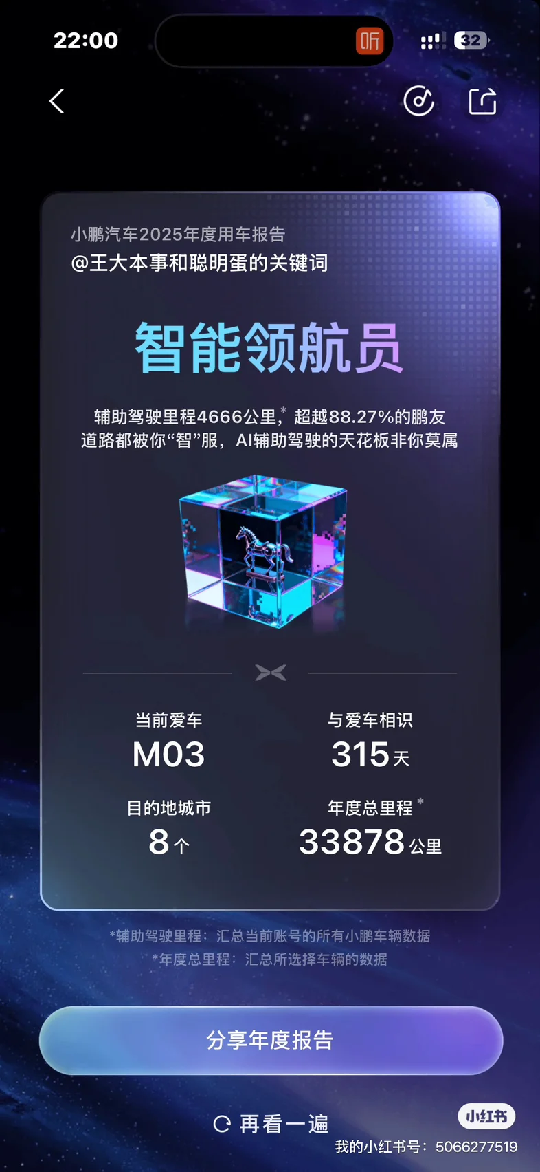 2025年度记忆:小鹏MONA承包了我所有快乐出行!总里程3.3w公里,一半是周末自驾露营路~图灵智驾在高速上太香了,长途开6小时不疲惫,自动变道果断丝滑;露营必用V2L对外放电,3.3kw功率煮茶烤肉全搞定,掀背尾门装下全套装备超能打!年度报告里最戳我的是318次智能泊车,小区窄车位、商场紧凑车库一键泊入,再也不用为停车焦虑;年末OTA解锁无麦K歌,自驾路上全车合唱太嗨了~