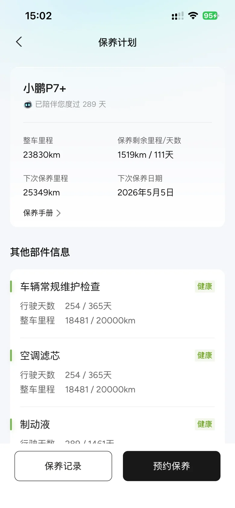 提车小鹏P7+已经289天啦,总里程跑到了23830km,日常通勤和家庭出游全靠它~目前保养剩余里程还有1519km,各项部件检测都是健康状态,省心又靠谱。作为年轻家庭的首选轿跑,它的空间够大,智能驾驶也超好用,过年开着它回老家,一路平顺又舒适,真的选对车了!