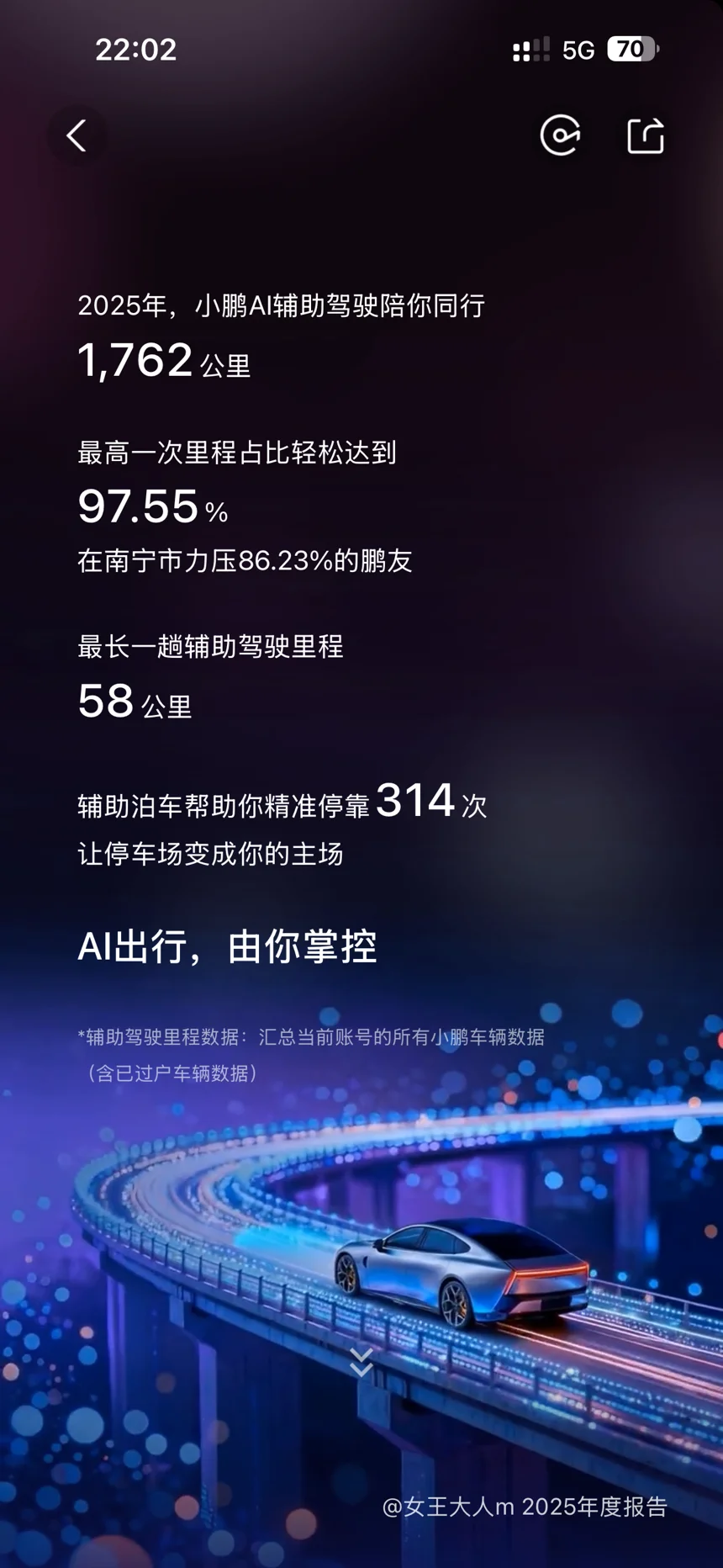 2025年,XNGP陪我同行了1762公里,最高一次智驾占比高达97.55%。无论是上下班通勤还是远程高速出行,交给NGP都让驾驶变得轻松又安心——方向盘轻握,双脚彻底放松,通勤的疲惫感大幅降低,长途自驾也成了一种享受。更别说314次精准的辅助泊车,让我几乎忘了手动停车是什么感觉。