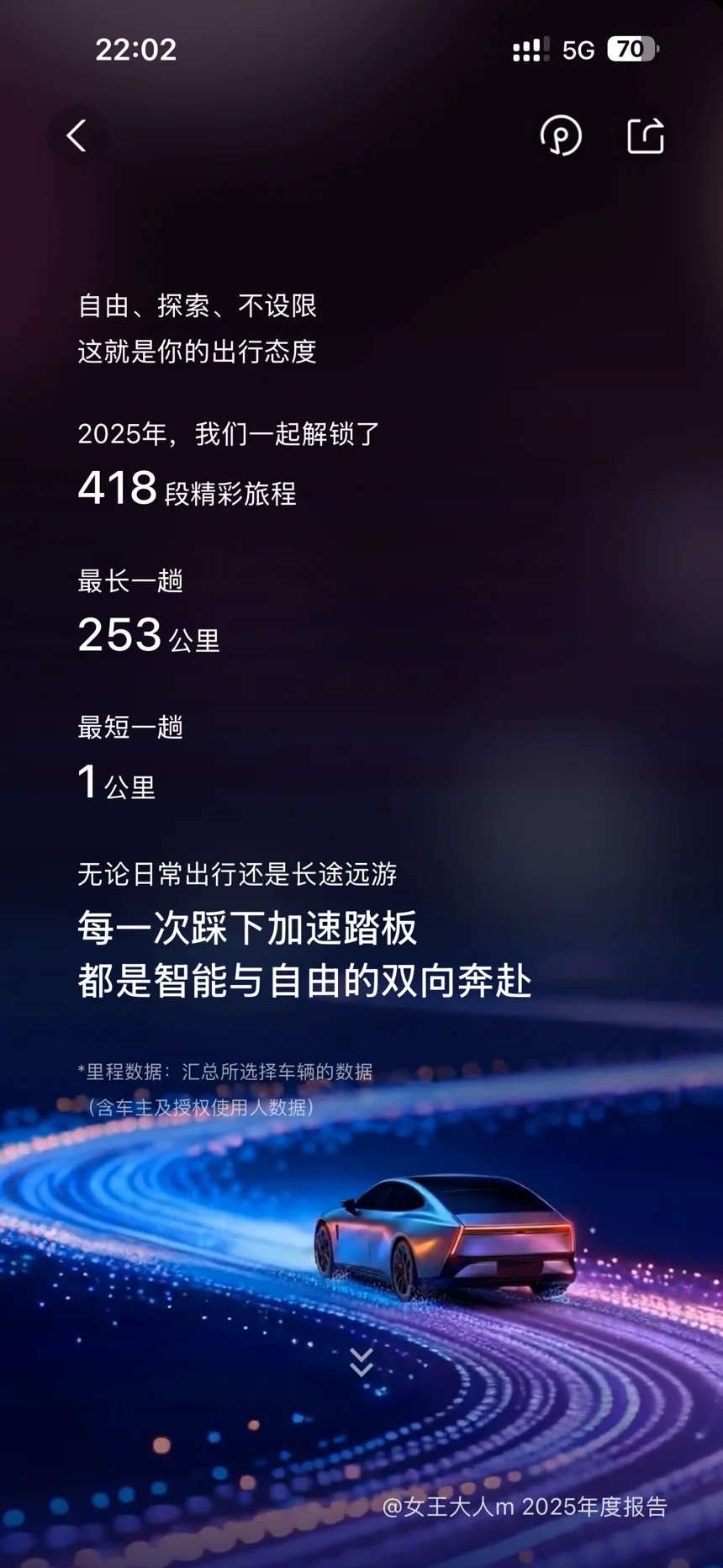 2025进度条已加载完毕,翻看我的小鹏年度用车报告才发觉,与我的新P7相伴的122天里,我们已经共同走过了6183公里,解锁了418段精彩旅程。从最长一趟跨城253公里,到日常通勤最短的1公里,每一次出发都写满了智能与自由的故事。