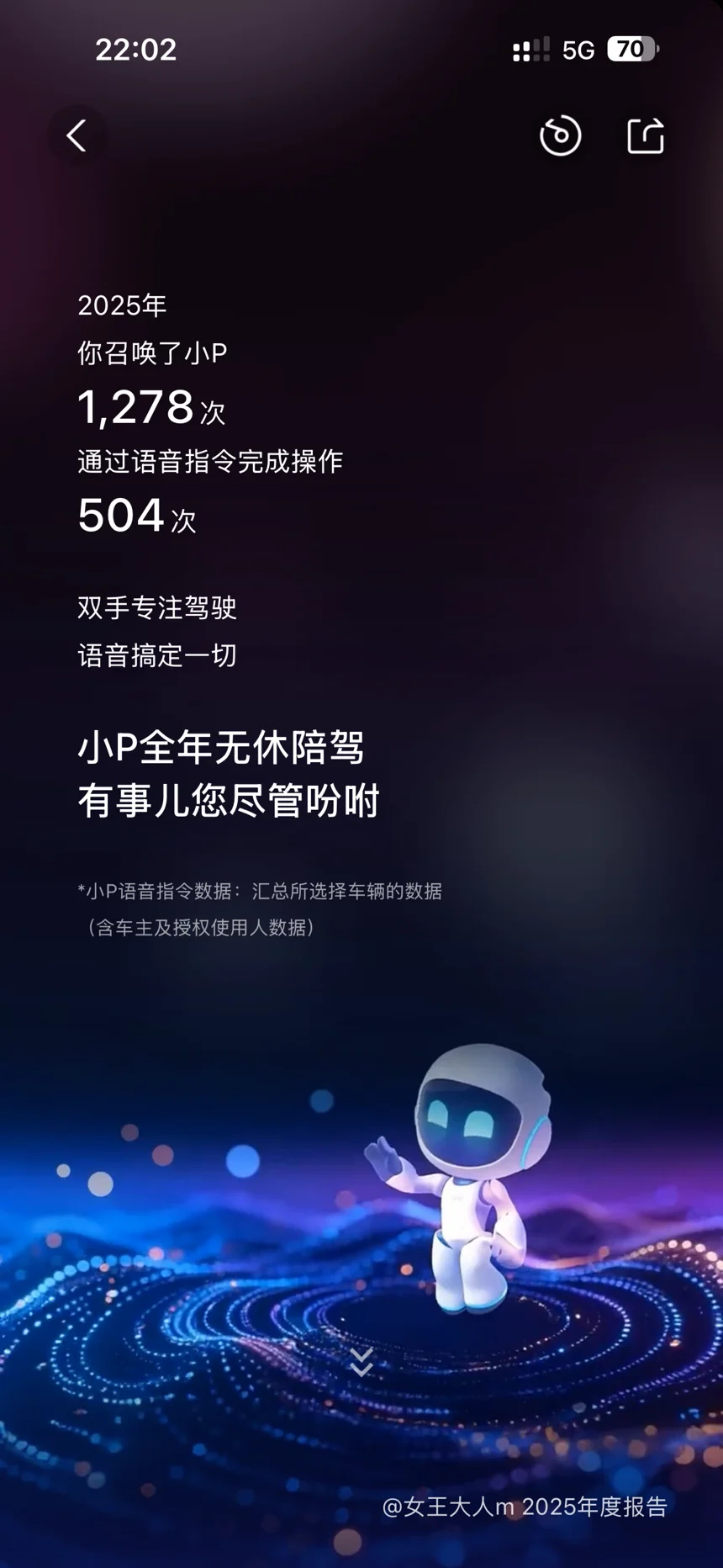 这一年,我召唤了小P 1278次,通过语音完成操作504次。从调节空调、导航选路,到播放音乐、开关车窗,真正实现了“双手不离方向盘,一切交给语音办”。小P就像一个全年无休的智能副驾,默契到仿佛能读懂我的下一句指令。