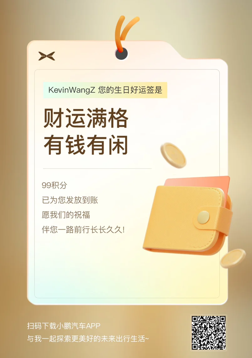 🎂 谢谢小鹏陪我过的第一个生日!收到这份“财运满格,有钱有闲”的好运签和99积分,真的特别暖心。在成为鹏友的这段日子里,不仅收获了便捷的出行体验,更感受到了品牌的用心和温度。这份带着满满祝福的礼物,让我觉得选择小鹏,不只是选了一辆车,更是加入了一个有温度的大家庭。愿未来的日子里,能继续和小鹏一起,一路前行,长长“99”,也祝我们都能真正实现“有钱有闲”的小确幸✨