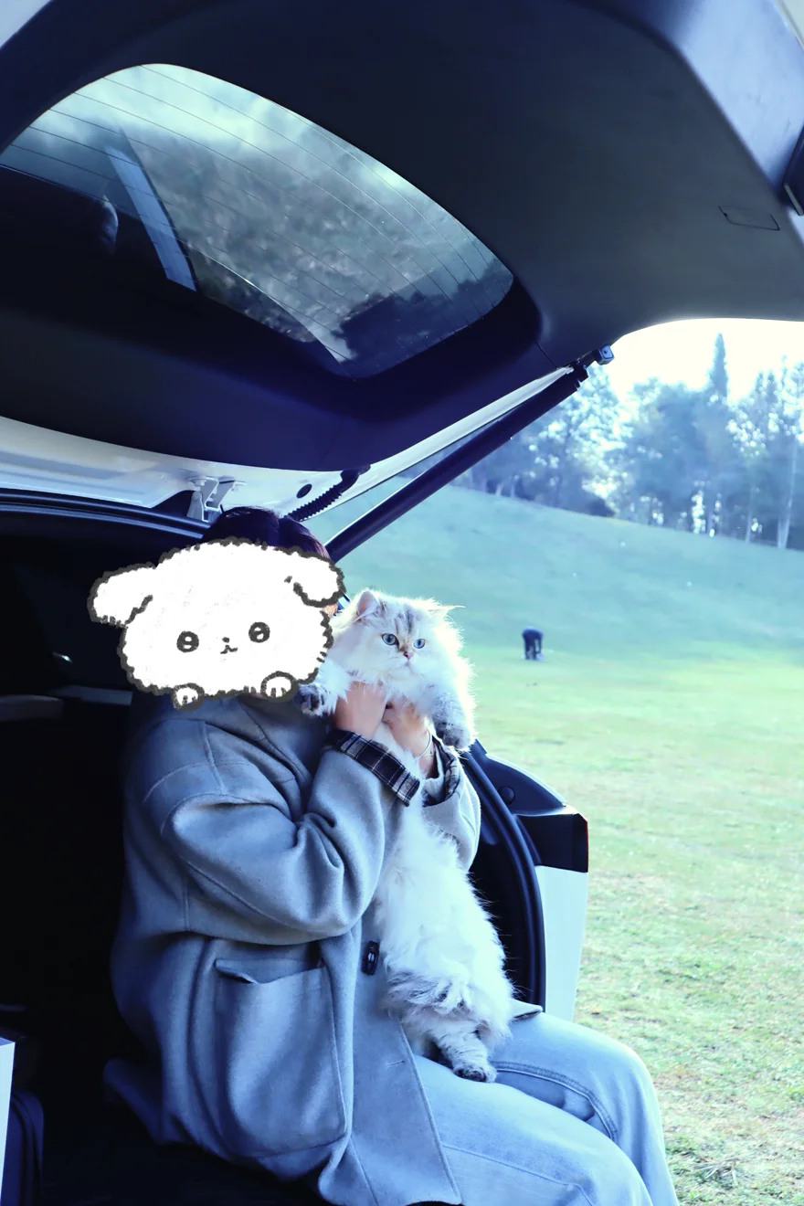 中途停在路边休息,一键开启宠物模式,空调自动恒温、车窗留缝通风,手机APP里就能实时看到它的动态,放心去溪边接水。回来时发现它正对着双屏发呆,中控屏还自动播放着舒缓的轻音乐,照顾了宠物的情绪。后备箱大容积超能装,猫砂盆、零食袋、折叠逗猫棒通通收纳整齐,隐藏储物格也能藏着它最爱的冻干,一点不凌乱。