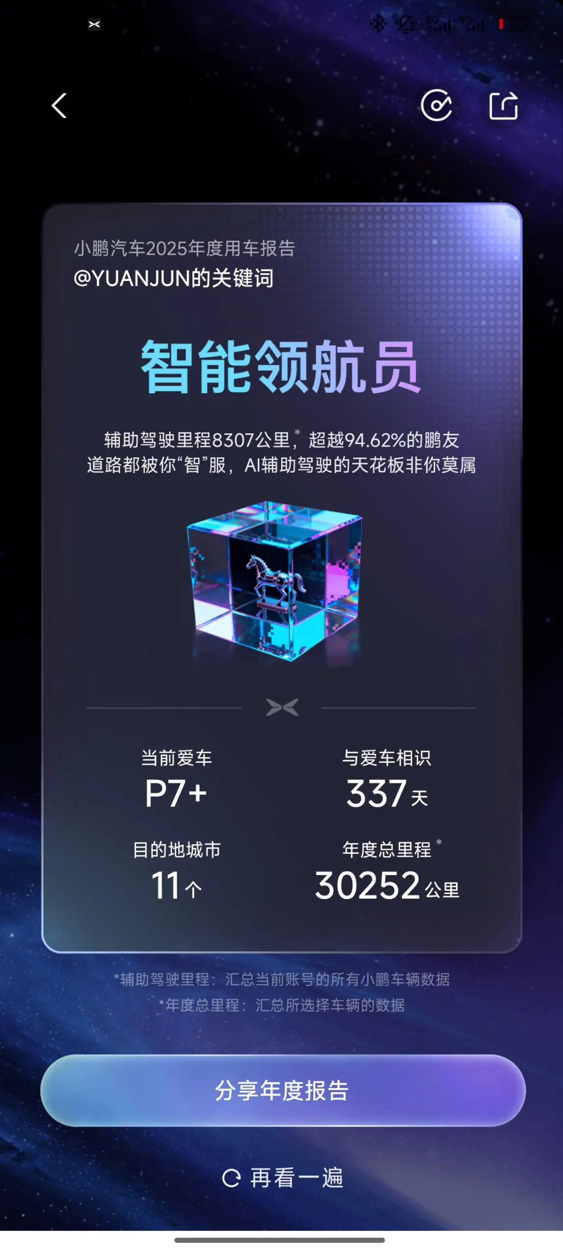 小鹏p7+陪伴我快一年了,在这一年的陪伴里,小p带着我和家人去了原始而神秘的神农架,去贵州看了中国天眼,去了云南昆明、大理、丽江、香格里拉,去了雪后的黄山等等,途径了大大小小30多个城市。在这些旅途中,必然少不了NGP的陪伴,它让每一次长途驾驶都变得轻松而安心。小鹏p7+还是我们贴心的“移动大床房”,后排座椅放倒,后备箱铺床垫,秒变温馨小窝,在九宫山躺在车里,透过天幕看满天的星星,在长途旅行中,也陪伴了我们无数个夜晚。2026年了,做好准备,开着小p带着妻儿开启新的旅程。#小鹏汽车 #小鹏P7加年度用车报告 #小鹏P7加年轻家庭首选轿跑 #开着小鹏回家过年