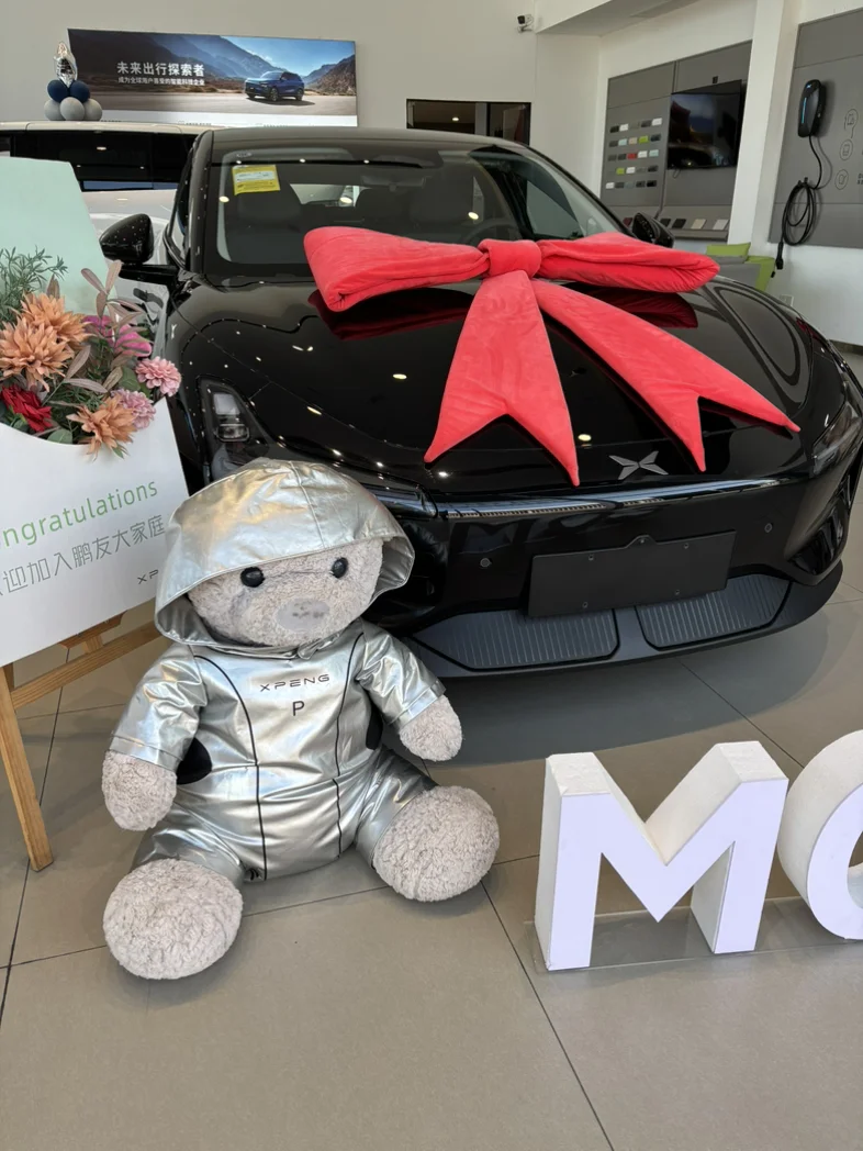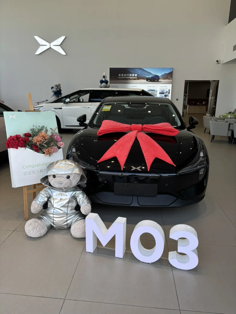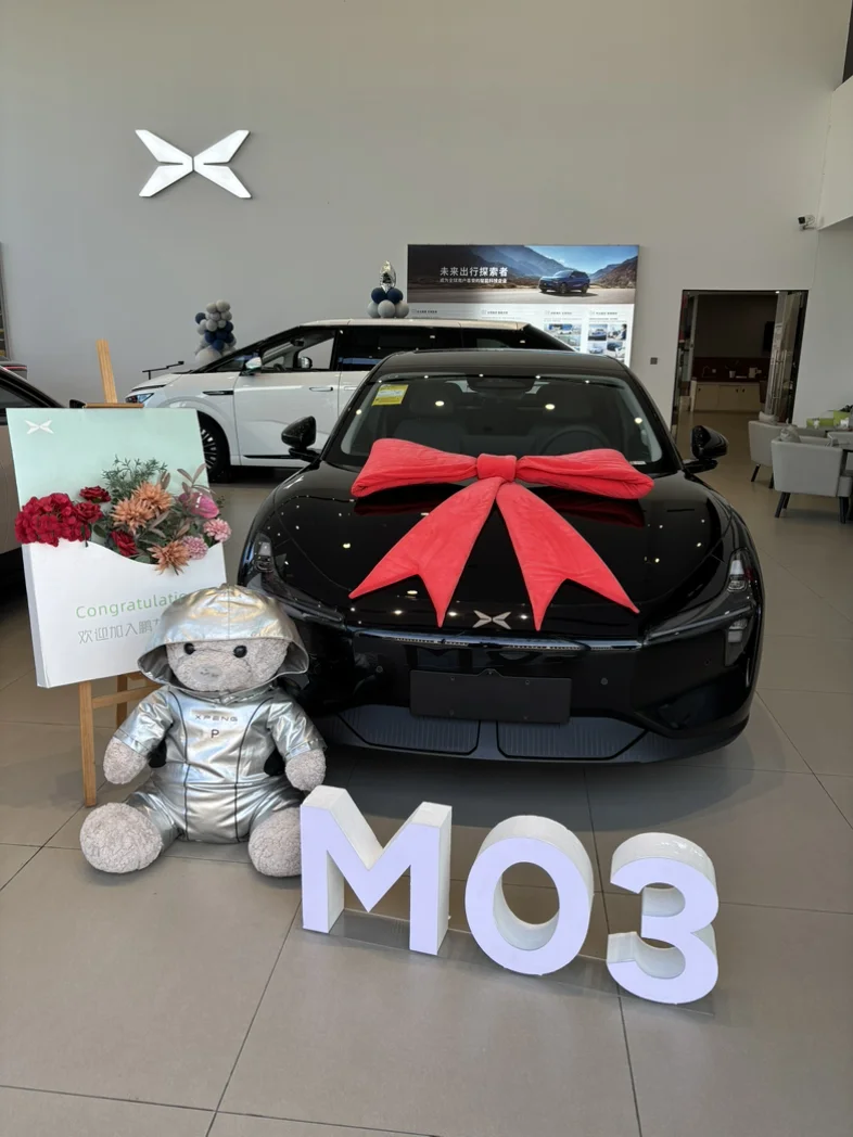 #我的提车作业# 小鹏 MO3,超酷的黑武士,就是喜欢他的颜值,没有理由!!!把我的小鹏 M03提回家啦,提车仪式感拉满,4S店里布置超用心,车身大蝴蝶结,专属"MO3"字母牌,还有可爱熊熊陪伴,加入小鹏大家庭啦~ #小鹏汽车、#小鹏提车