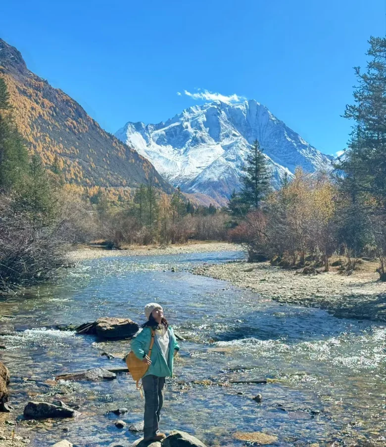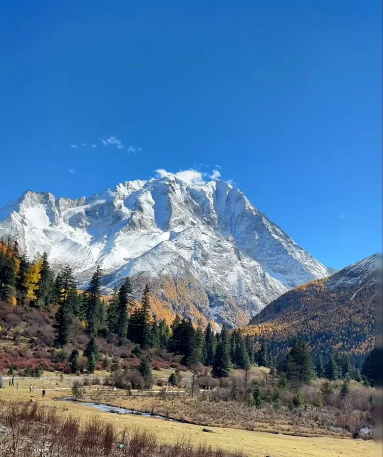 站在大门口,就能看到一条彩林通向就在眼前的雪山,秋天所有的颜色都在这里。⛺️露营需要提前跟景区预约,观光车坐到山顶,徒步或者骑马两公里有个超美的海子