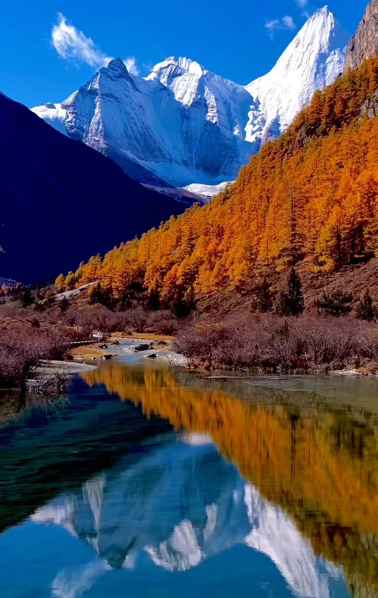 雪山下的小村庄,有彩林的季节真的美哭了