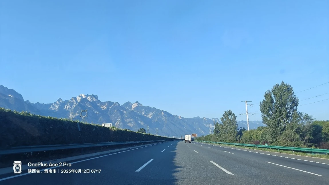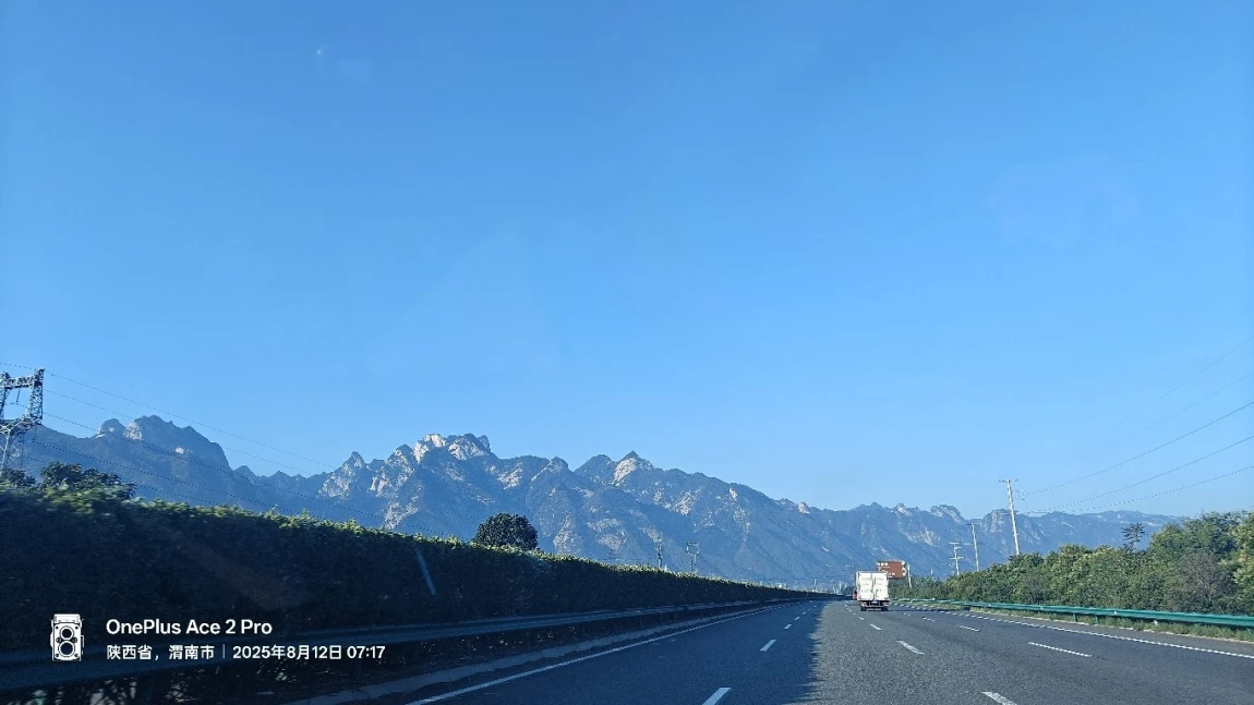 在渭南的清晨,我们驶上高速,远处的华山轮廓在蓝天里格外清晰。