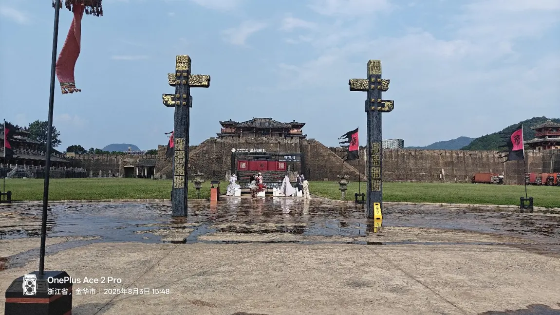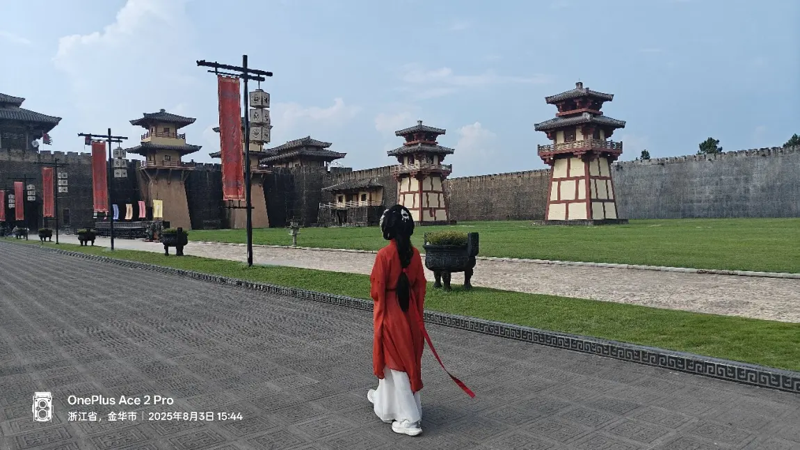 在横店秦王宫,红墙黑瓦的宫殿群里,仿佛穿越回了大秦盛世。
