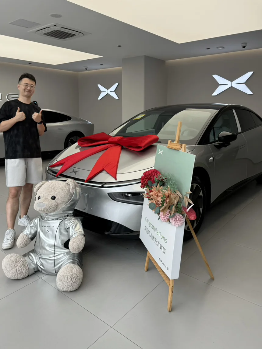 记忆的开篇,始于展厅。银色车身上的红色蝴蝶结,和那只系着“祝贺”牌、穿着银色宇航服的熊。那一刻,我正式成为“鹏友”。这不仅仅是一把钥匙的交接,更像是一个充满未来感仪式的开始,预示着接下来的旅程将通向更远的地方。