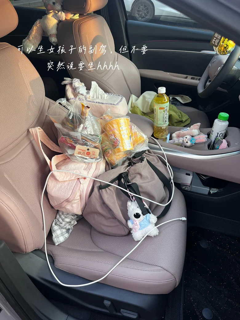 P8️⃣:女孩子车内实录🚗,什么都要堆在副驾,M03的空间女孩子用正正好,极繁主义者狂喜,啥都能装在车里,后备箱够大,放平都能当自驾的床车用了