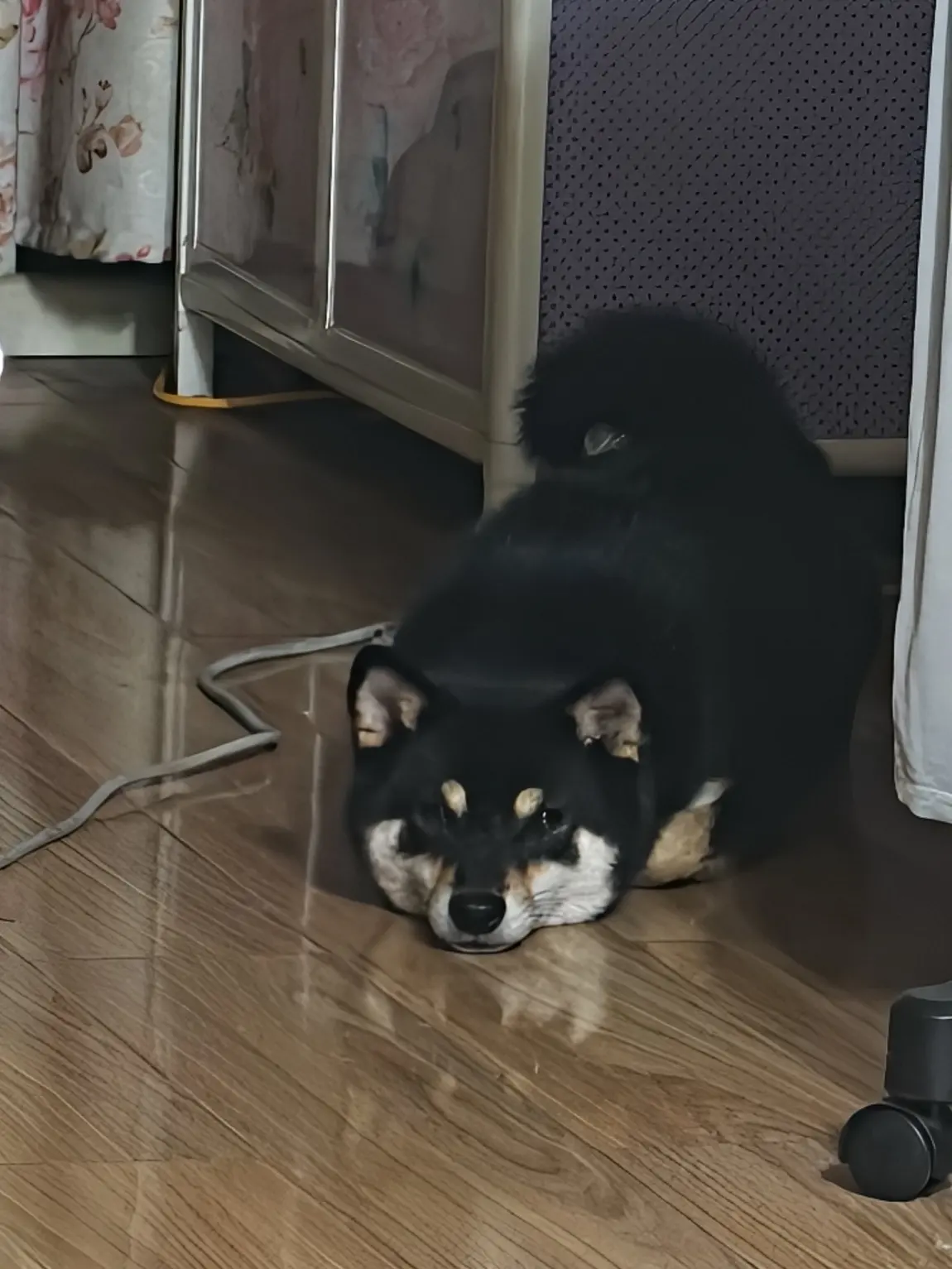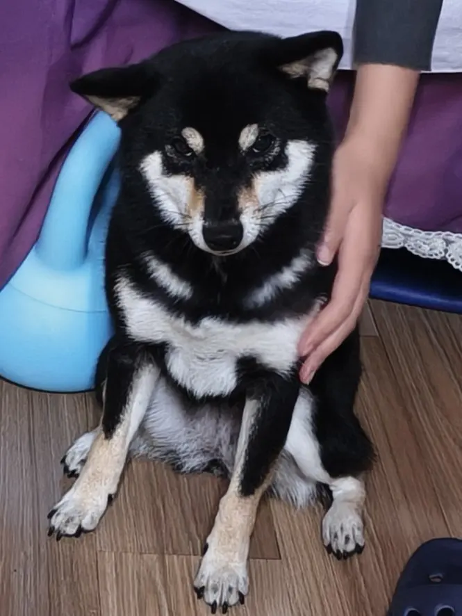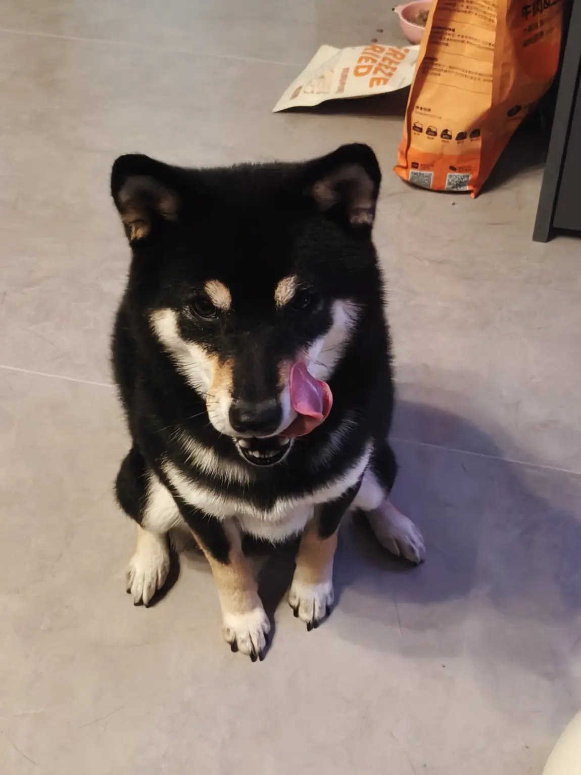- 黑柴弟弟吐舌头歪头杀,肉垫踩在地板上哒哒响,摸它肚子会把爪爪搭我手上~