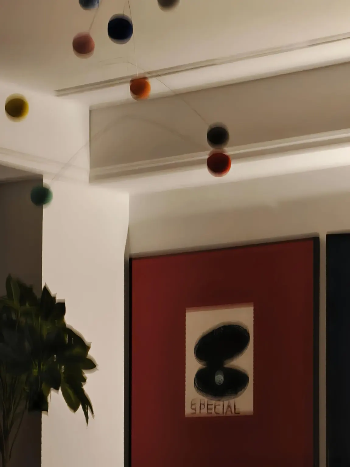 - 房间吊灯的彩色球球转呀转,光影投在红墙上,像把彩虹揉碎了挂起来
