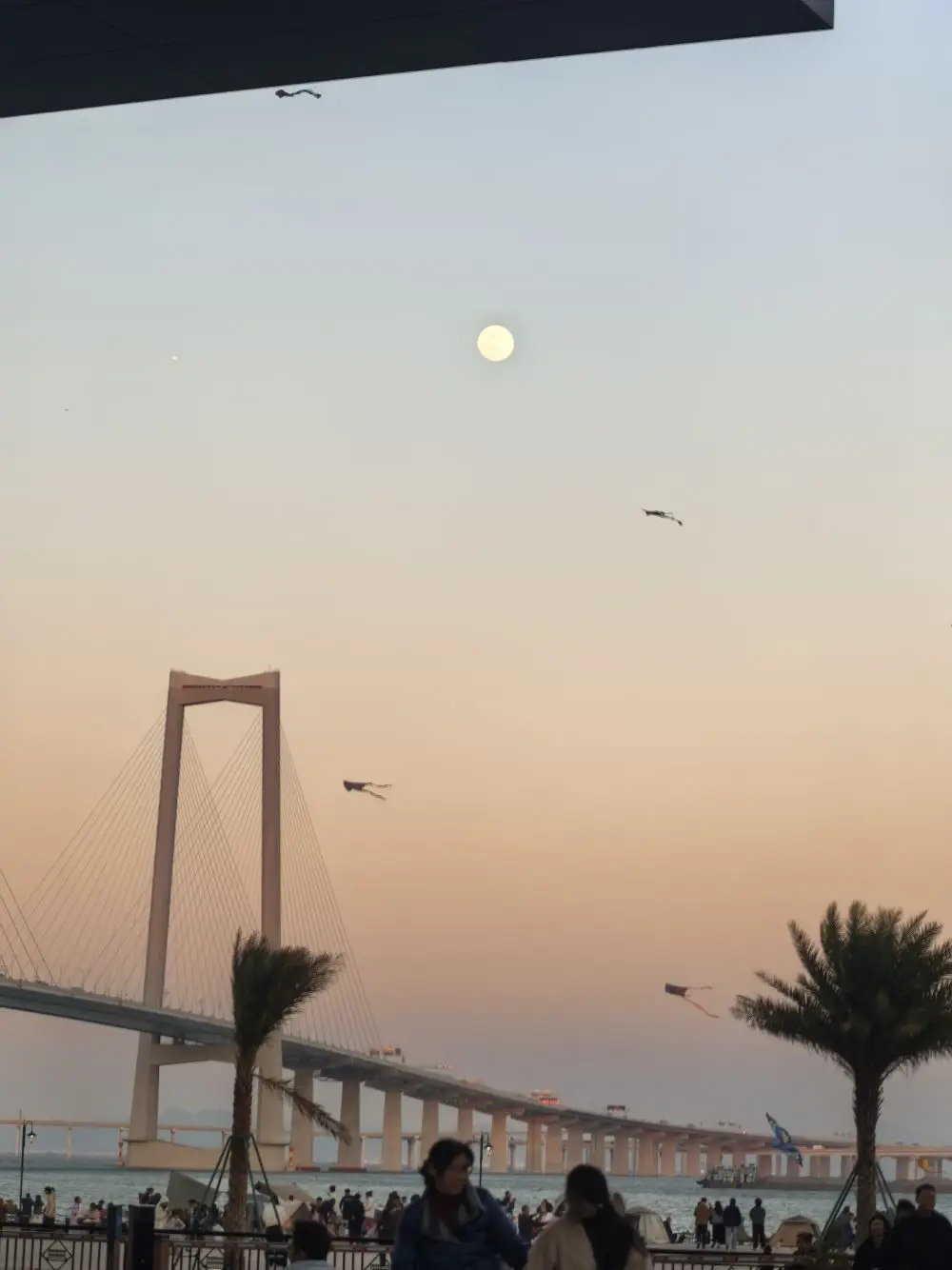 第二天直奔深中通道日出观赏点,没想到误打误撞邂逅了绝美的夕阳。吹着海风围炉煮茶,看着跨海大桥在暮色里慢慢亮起灯,突然觉得天天打工的疲惫,都被这片刻的惬意治愈了。晚上还吃到了心心念念的电白捞粉,那一口老家的味道,真的终身难忘。