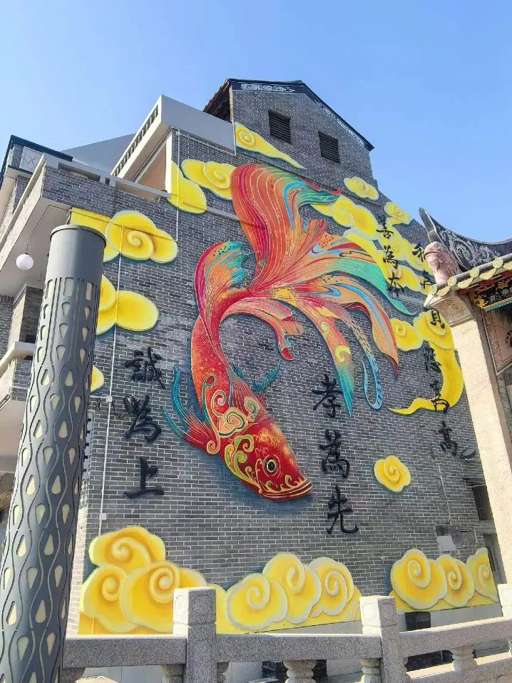 🎨 巨幅锦鲤墙:古建上的鲜活色彩