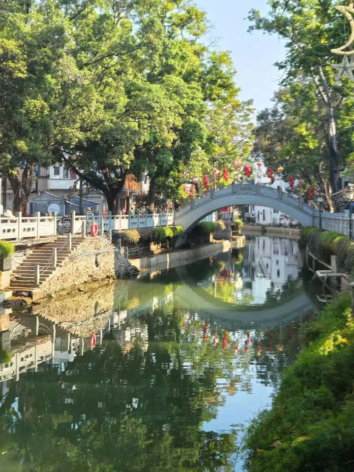 第一站直奔粤韵桥。红黄色的灯笼在水面投下暖光,古桥倒影随着水波轻轻晃动,我站在桥中央,用手机随手一拍就是一幅江南水乡图。
