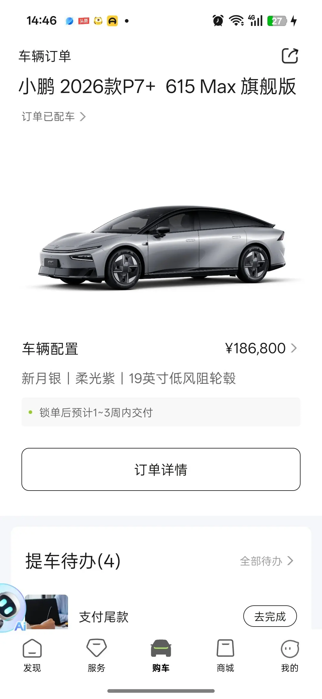#小鹏汽车 #晒出我的26款小鹏P7加大定 #超大空间AI智能轿车终于敲定我的26款小鹏P7+啦!大定截图奉上,这波操作必须晒出来~当初选车纠结了好久,最终被小鹏P7+的超大空间狠狠拿捏!不管是后排翘腿还是放行李箱,都毫无压力,周末带家人朋友出游,再也不用纠结谁坐副驾谁挤后排啦。 更别说它的AI智能系统,语音控制超丝滑,导航、开空调、放歌一句话搞定,完全不用动手,科技感直接拉满。作为颜控,它的外观也长在我的审美点上,流畅的车身线条,简约又大气,开出去回头率超高!