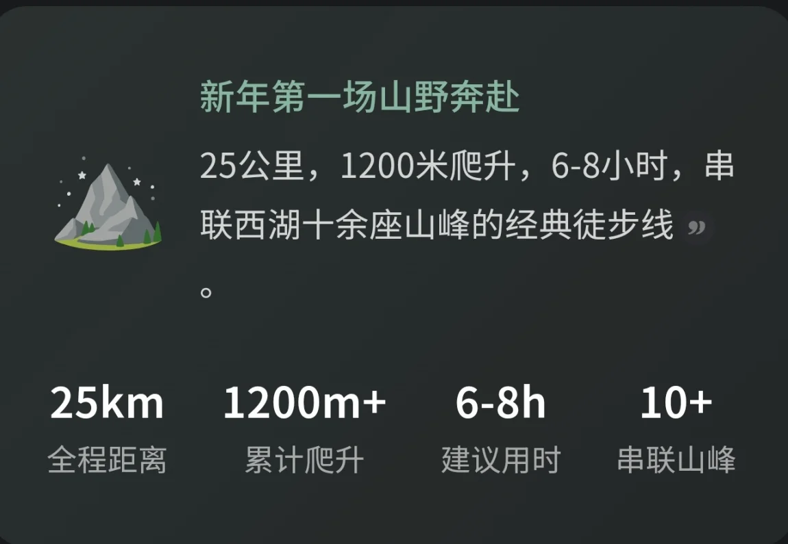 2026年的第一天,没有选择赖床,而是直接从温州出发直达杭州,背起行囊,奔赴一场与西湖群山的约定——挑战经典的“标毅线”。这条被杭州户外圈称为“城市山地徒步毕业考”的路线言》,用25公里的山脊线,串联起老和山、北高峰、天门山、五云山、玉皇山等十余座山峰,每一步都是对体力与毅力的双重考验,每一眼都是湖光山色的犒赏。