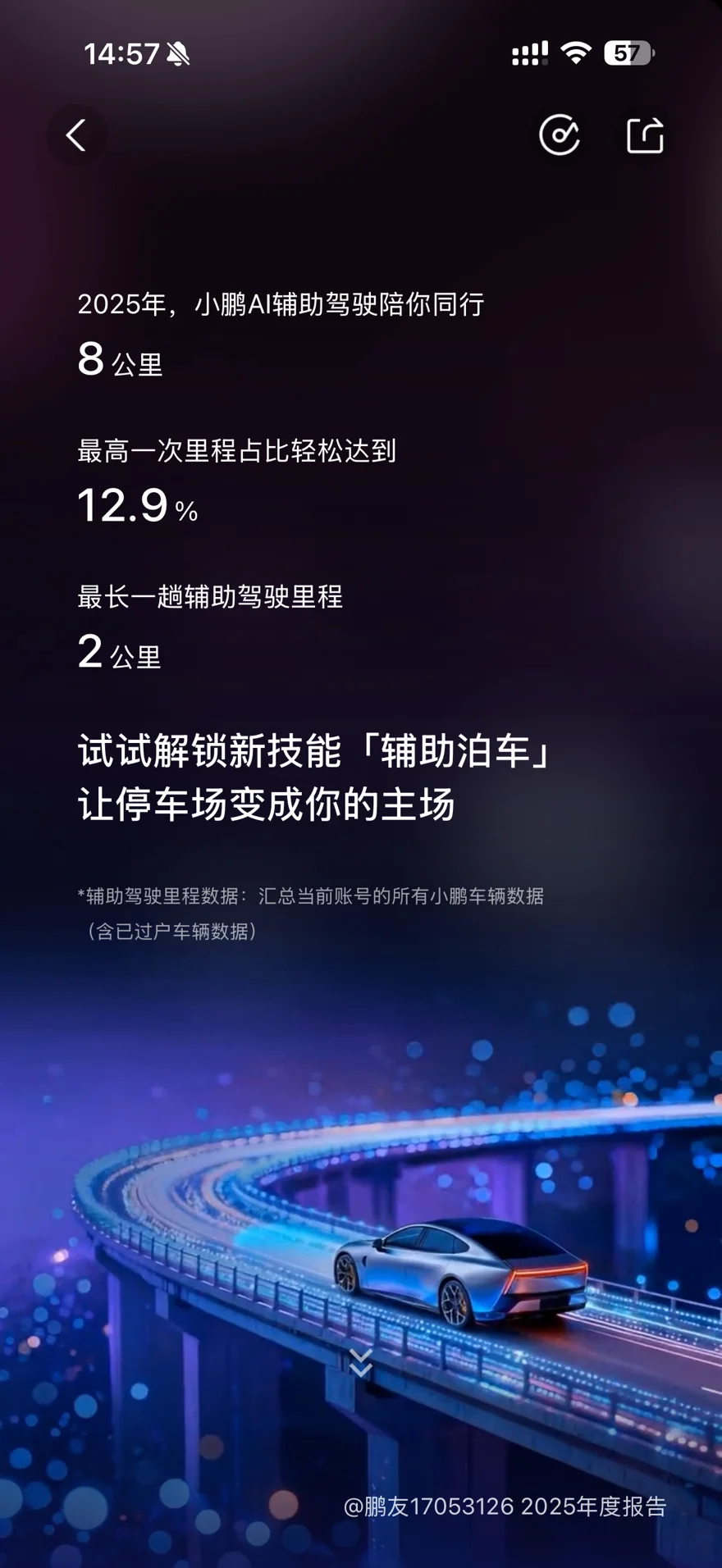✨我的小鹏2025年度报告新鲜出炉!被官方盖章「智能同行挚友」啦🚗💙和M03相伴61天,跑了2122公里,解锁3座城市的风景。智能辅助驾驶全程在线,安全感直接拉满!每一段路都像有个靠谱搭子在身边~新的一年,继续和小鹏一起解锁更多地图,马年走起🏇#小鹏MONA M03# #小鹏汽车2025年度用车报告# #初小鹏汽车#