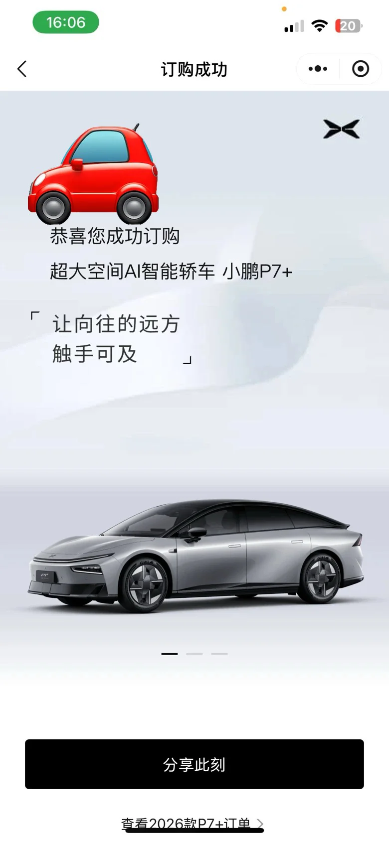 #我的提车作业# #我订车啦# 从一开始的关注到p7+,到后来的去了解,默默喜欢了很久,再到下定后的惊喜和期待,直接提车的时候才觉得一切来的这么突然,感觉好像一切都那么的不真实。新款的p7+从外型到内饰都充斥着年轻的时尚,内饰十分漂亮,座椅很软坐着很舒服。空间也很大,无边框车窗的设计,掀背式后备箱,各种设计非常精致。 往后的日子就由我的p7+陪我去开启新篇章了 “让向往的远方触手可及”