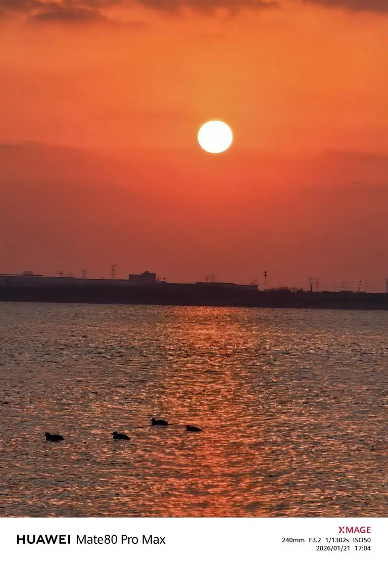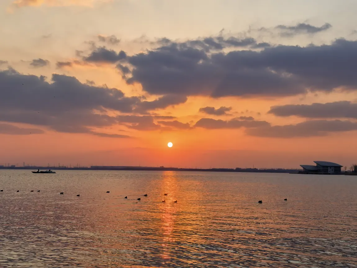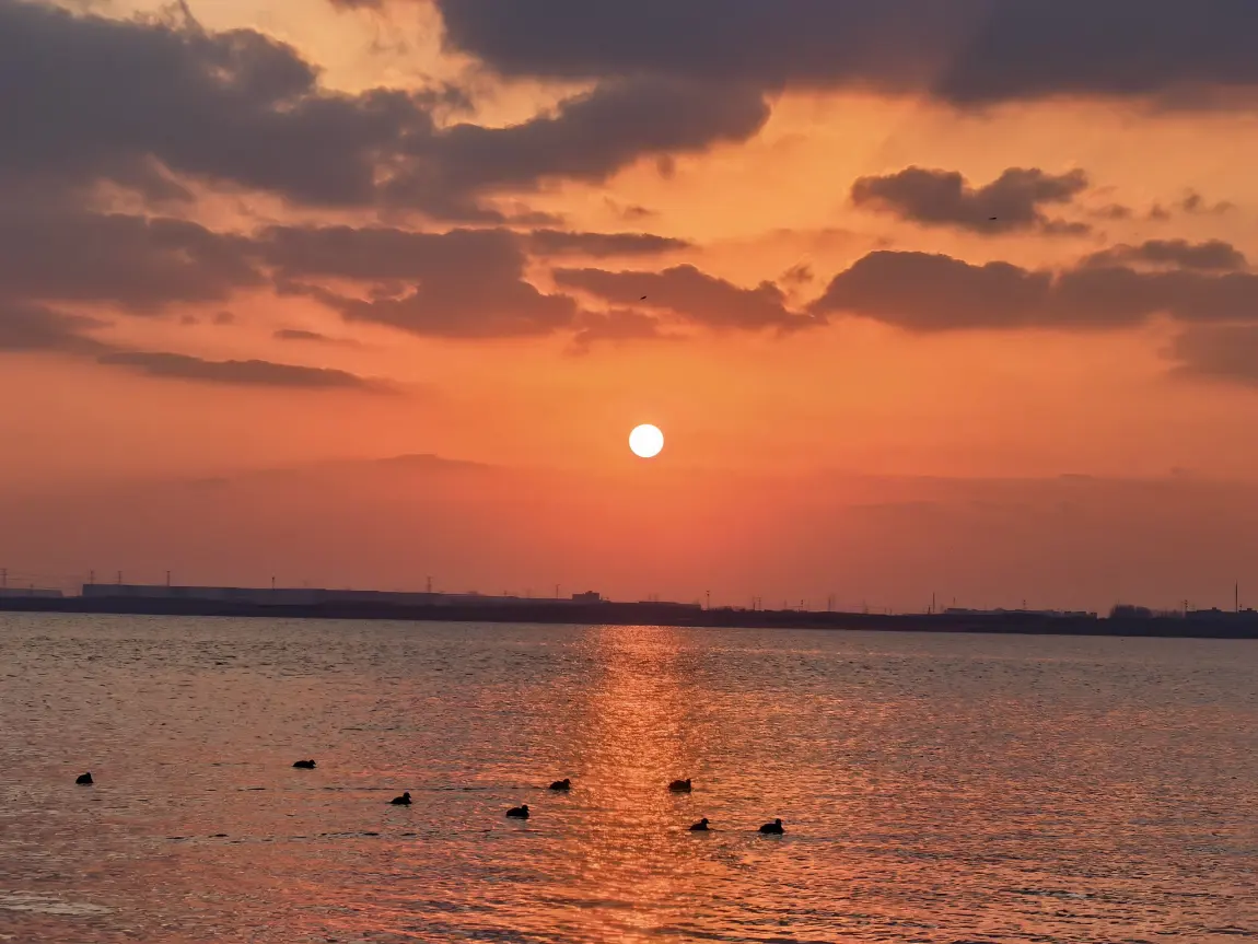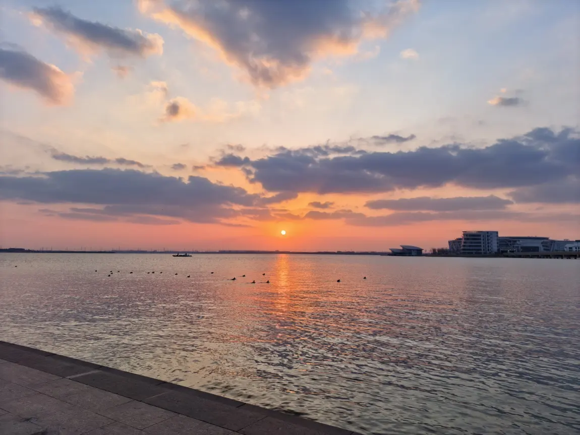 今天天气虽然很冷,但天气晴朗,下班后去拍了下湖畔夕阳,很美