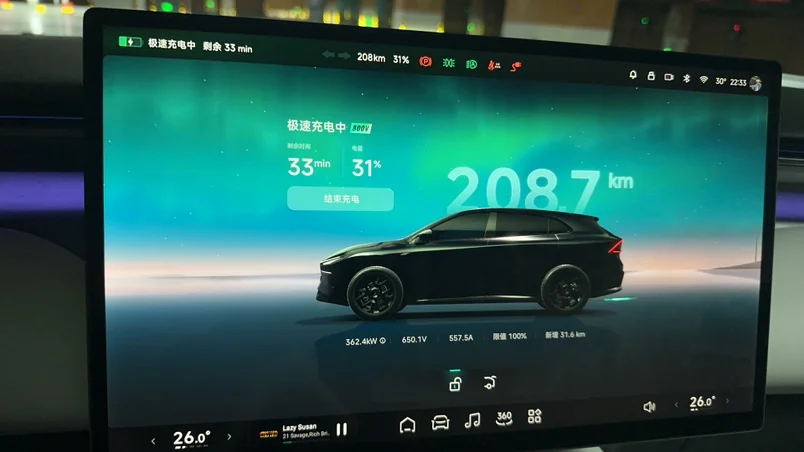 最绝的是全系标配的图灵AI智驾和87英寸AR-HUD!导航光毯直接“画”在路面上,转弯变道精准指引,暴雨天还能虚拟生成车道线,新手也能轻松拿捏复杂路况。5C超充+800V高压平台更是彻底告别里程焦虑,上次高速服务区喝杯咖啡的功夫,12分钟就从10%充到80%,补能效率比加油还快!