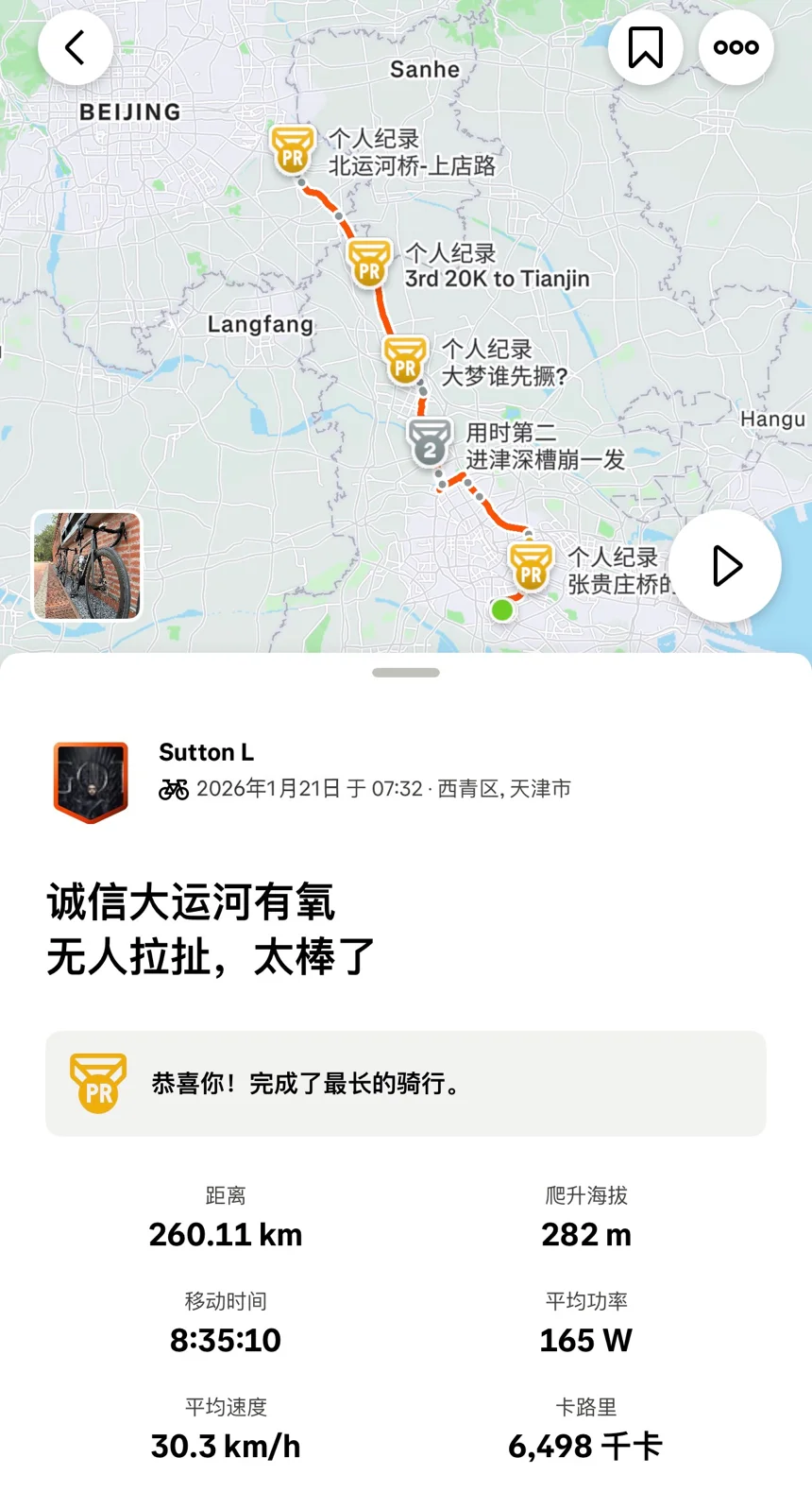 早上7点从天津西青出发,一路沿着外环南路,外环东路,再到京津线穿过北辰,武清,最后到达通州大运河,一路上有很多超市加油站都可以补给,建议带好补胎的工具,多带能量胶和盐丸,避免抽筋,一路上风景如画,大运河景区更是水声潺潺,但还是要说明白,长距离挑战适合有运动基础的人,新手不要盲目挑战哦,最后祝大家多多运动,拥抱健康!