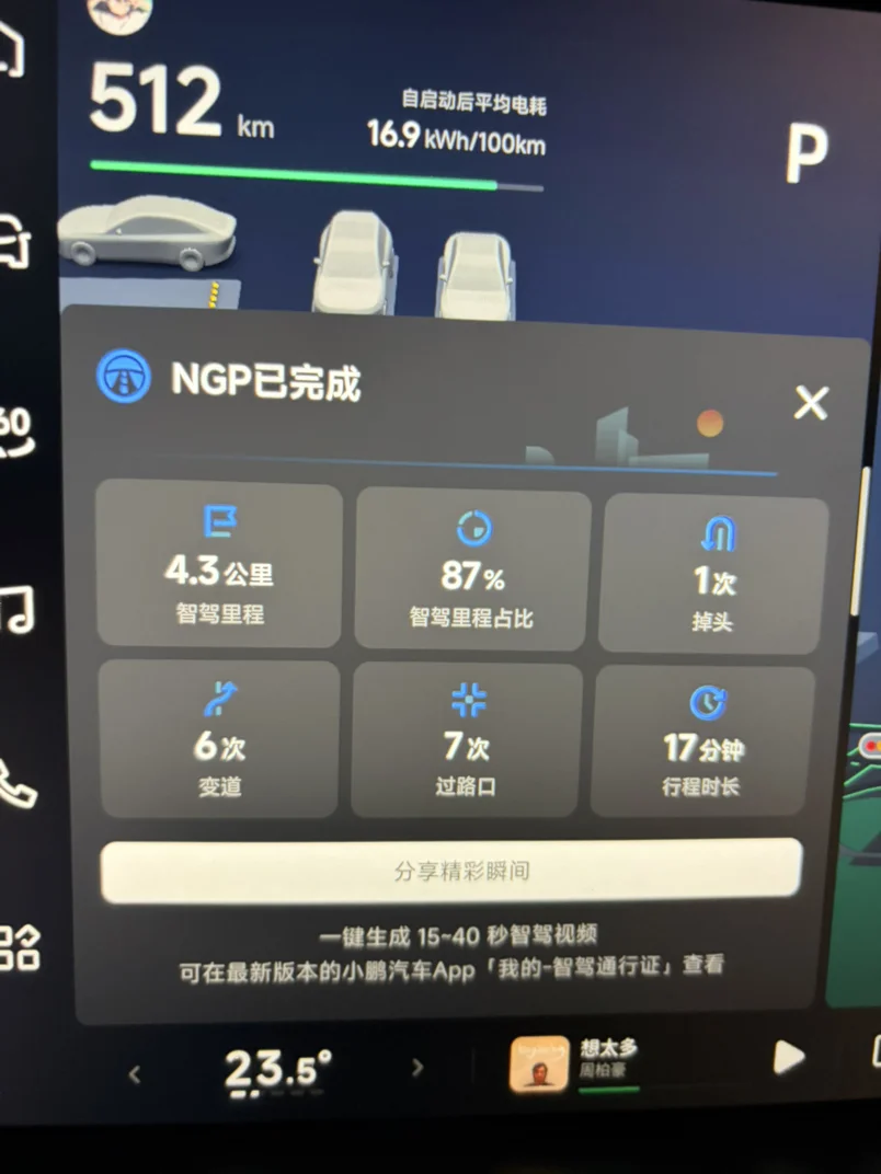 新年第一次充电,深夜出发,顺便使用下ngp,ngp的体验还是挺好的,识别还是蛮精准的,不过还是得认真看看路况呢。充电的体验也不错,界面好看,时间还好,不一会儿就充满啦,开ngp回家。