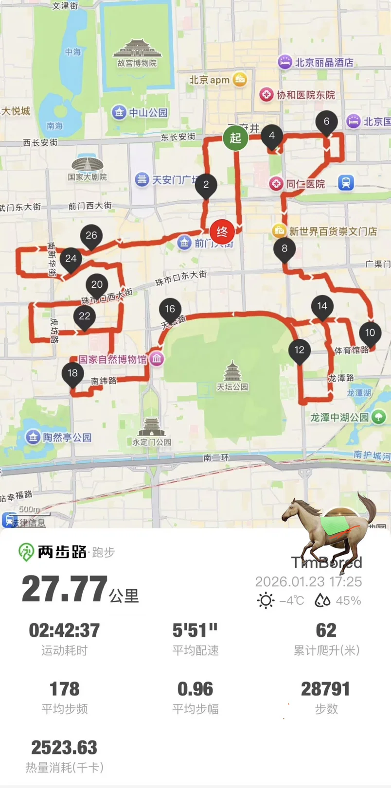 下午两点准时开跑,冬日的街头风有点凉,但跑起来浑身都热乎🔥 按平时的配速稳扎稳打,半马段2小时05分轻松拿下,和日常训练节奏完全一致,状态拉满!全程2小时42分顺利冲线,前门大街的终点线也太有纪念意义了~