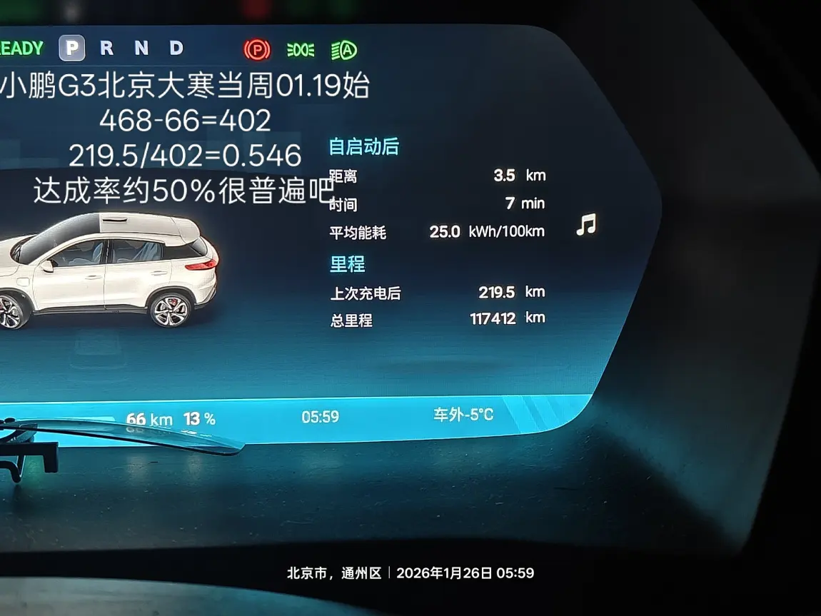 北京大寒当周01.19始,本周是四九的第三天到第九天,白天最高温普遍在冰点以下,夜晚最低温达-15℃。早上骑电动车上班会很难受。 小鹏G3在周一小鹏超充站充满电后(95%),显示soc为468公里。待7天后又一个周一充电前,显示剩余电量13%,可跑66公里。如此一来,可以计算:消耗电量468-66=402实际跑了219.5/402=0.546 续航达成率约50%很普遍吧